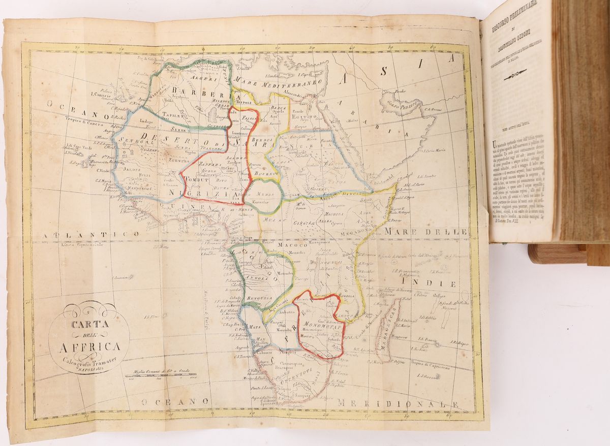 In 16°. Tomi VIII, IX, X della prima edizione napoletana di questa celeberrima e monumentale opera, largamente apprezzata nel corso dell'Ottocento per la vastità della documentazione e dell'iconografia raccolte che la rendono una miniera di informazioni storiche, geografiche, folkloriche, etnologiche ed antropologiche di parti del mondo all'epoca ancora molto poco conosciute. Carta geografica dell'Africa nel primo volume e numerose altre incisioni acquerellate a piena pagina in tutti e 3 i voll. Legatura in piena pergamena coeva con tasselli di pelle con titoli in oro al dorso. Lavoro di tarlo passante al terzo volume che lede marginalmente il testo.