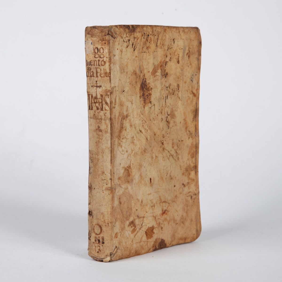 In 16° piccolo. Ristampa corretta della prima edizione del 1565 di questa famosa opera del medico ed alchimista bolognese Fioravanti. Contente ricette di svariati rimedi, pillole, palle odorifere ed elisir contro la peste. Legatura in piena pergamena floscia coeva con titolo manoscritto al dorso.