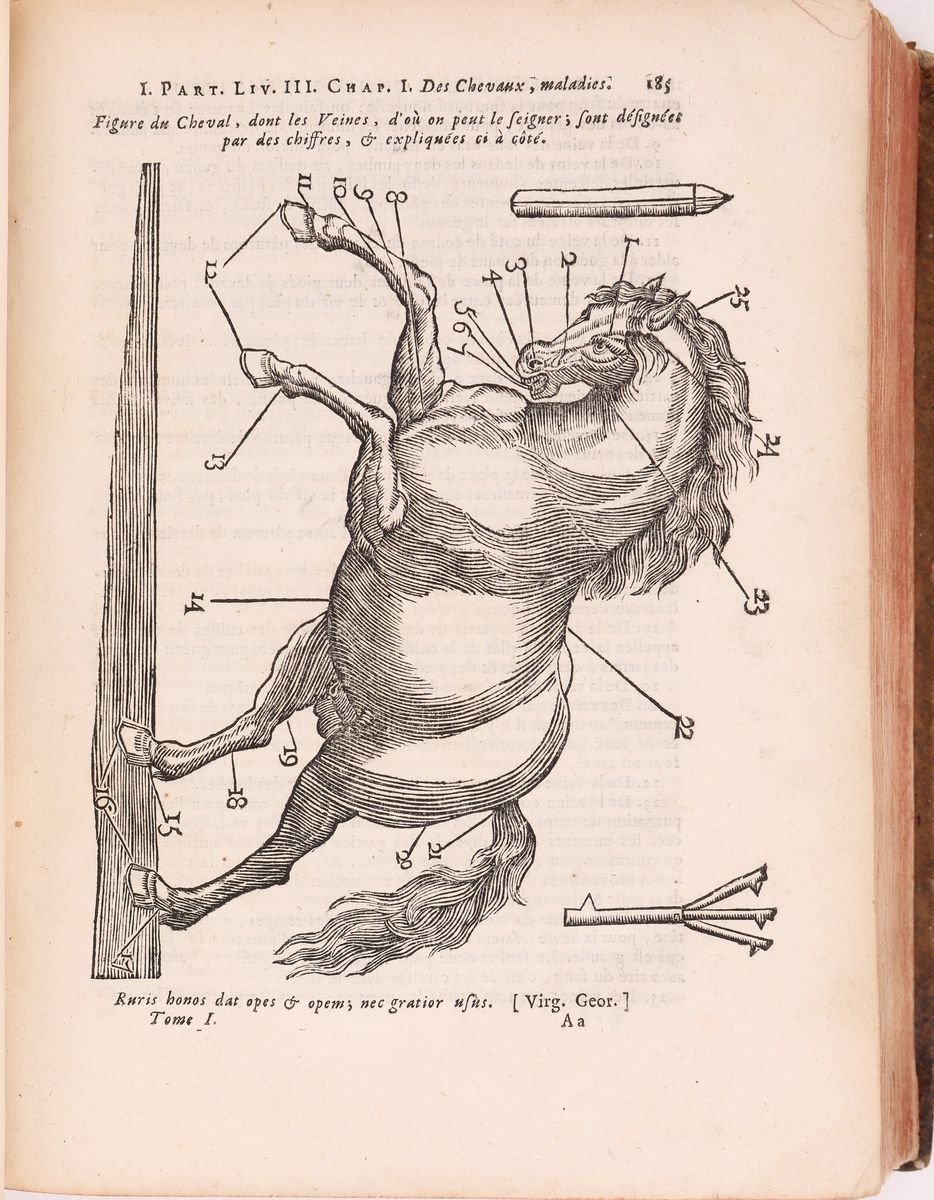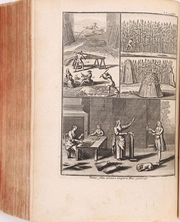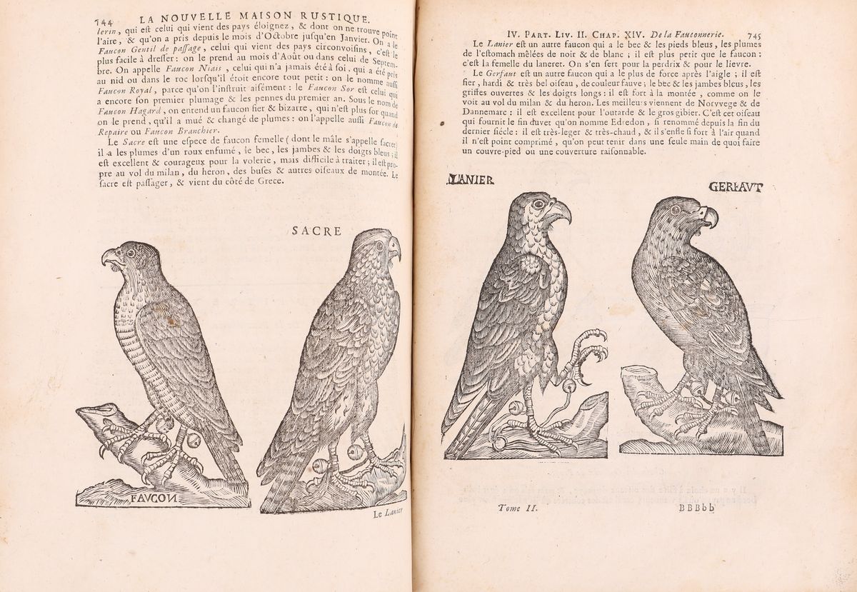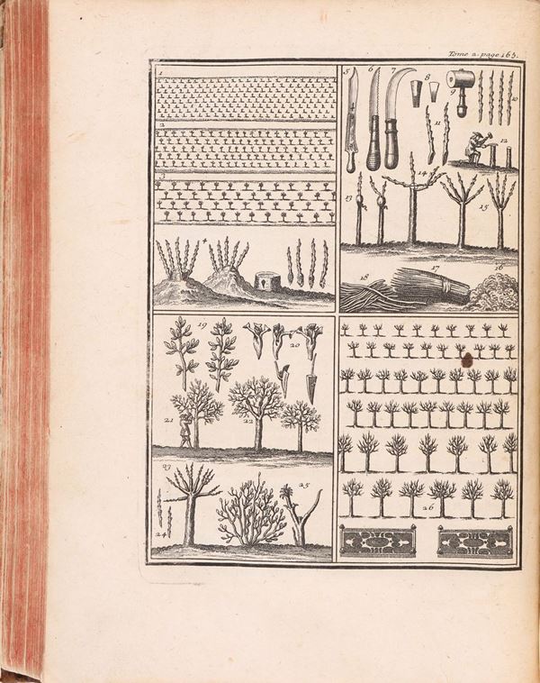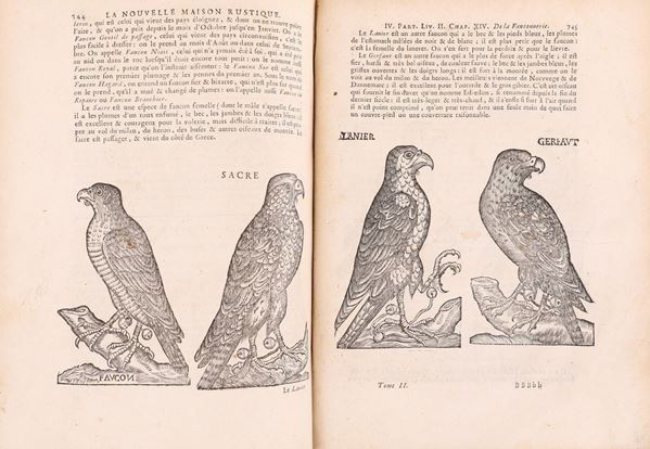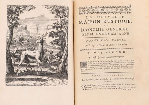 In 8°. Due volumi, quarta edizione aumentata. Riccamente illustrato con numerose incisioni nel testo, a piena pagina e ripiegate. Fondamentale trattato di agricoltura, allevamento, giardinaggio, caccia, pesca, con numerose ricette di cucina, pasticceria, nel quale si argomenta anche di falconeria, api, cavalli, cani da caccia, alberi da frutta e vigneti. Legatura in piena pelle coeva (restauri) a cinque nervi; titoli e fregi in oro al dorso; tagli rubricati. Frontespizi con piccole mancanze, strappi e note manoscritte. Lacerazioni, strappi e mancanze ad alcune pagine e tavole. Lotto non passibile di restituzione.