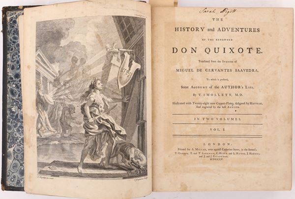 In 4° 2 Volumi. Pregiata e ricercata edizione illustrata settecentesca in lingua inglese, la prima di Smollet del capolavoro della letteratura spagnola. Riccamente illustrata con tavole a piena pagina raffiguranti scene del romanzo. Legature in piena pelle coeva con titoli e fregi e 5 nervi ai dorsi, fregi sui piatti.