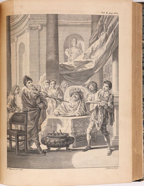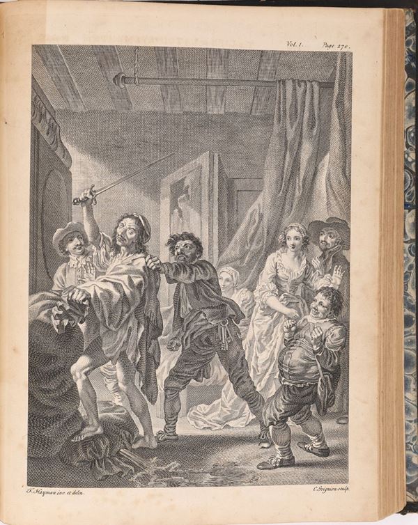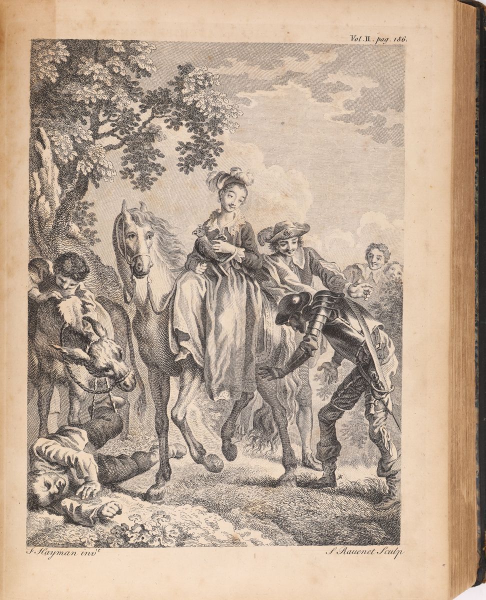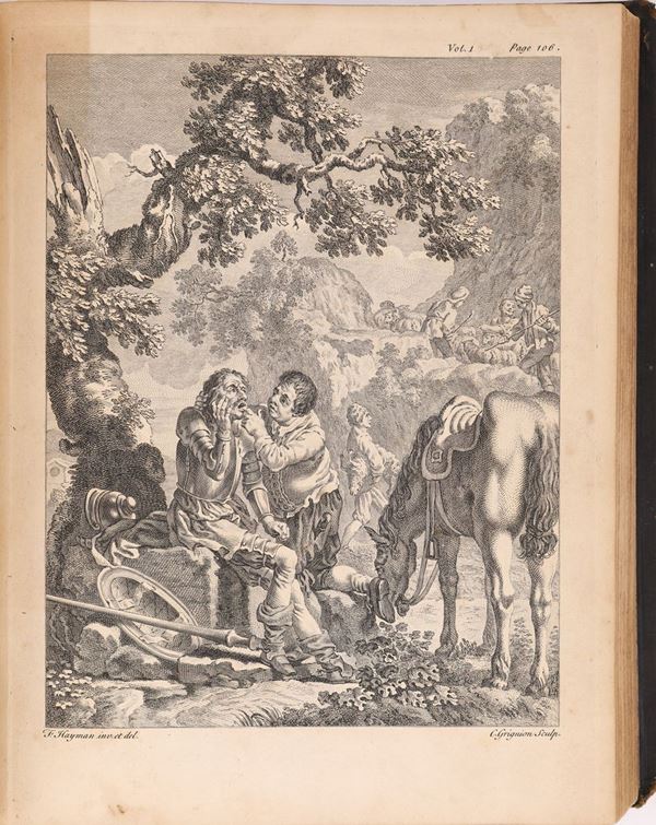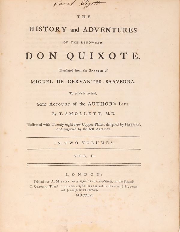 Miguel de Cervantes Saavedra. The history and adventures of the renowned Don Quixote. Translated from the Spanish of Miguel de Cervantes Saavedra To which is prefixed, some account of the Author's life by T. Smollett, M.D. Illustrated with Twenty-eight new Copper-Plates, designed by Hayman, and engraved by the best Artists, A.Millar, T.Osborn and T.Longman, Londra 1755