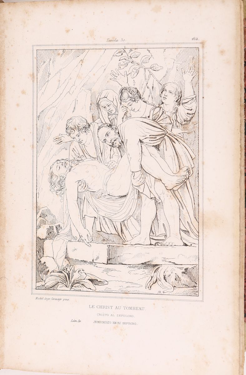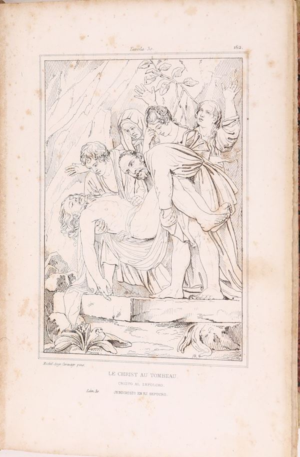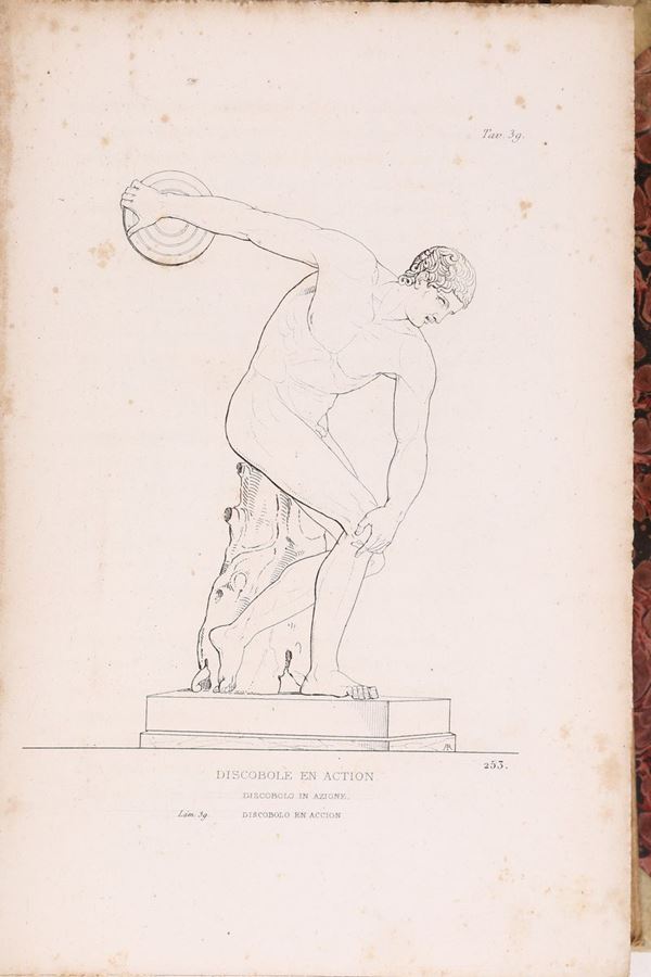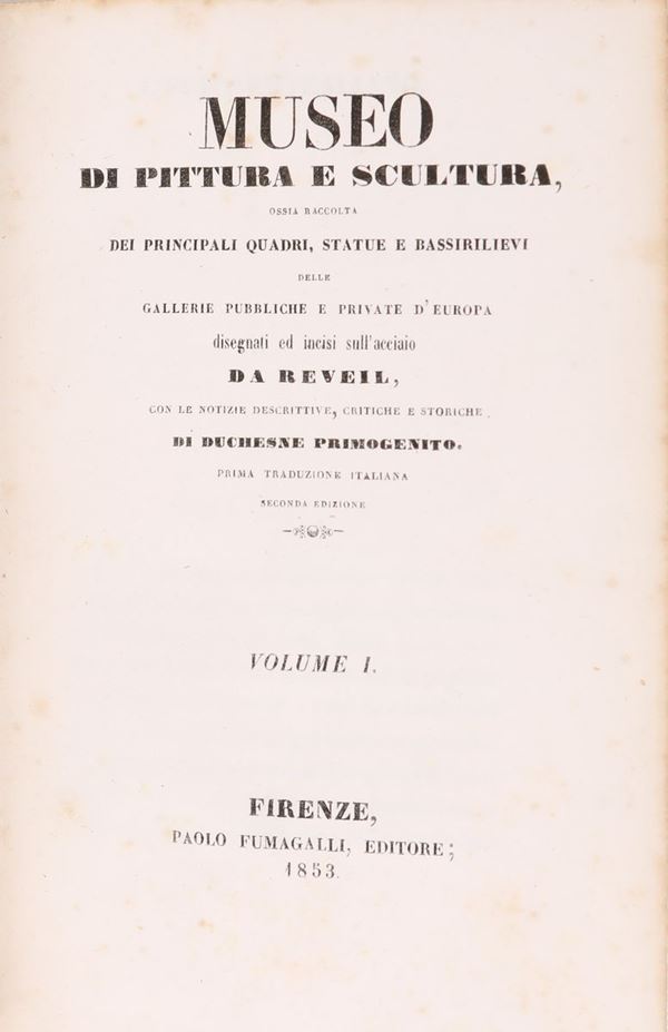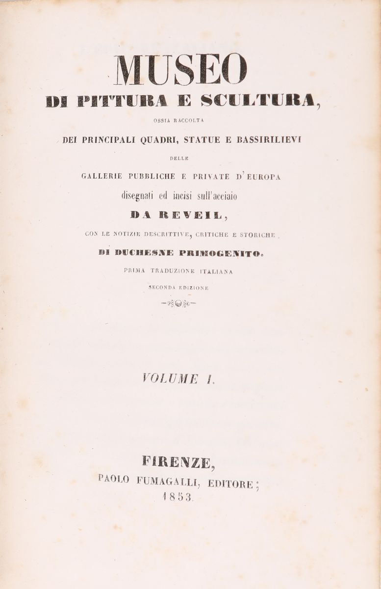 In 16° XIII volumi (10 voll. più 2 voll. di Appendice ed un ultimo colle Notizie Biografiche degli Artisti). Seconda edizione, completa, della prima traduzione italiana di questa monumentale opera che raccoglie molti dei principali capolavori dell'arte custodite nei principali musei e collezioni del XIX secolo, riccamente illustrata da 1500 incisioni in acciaio a piena pagina di Etienne Achille Réveil. Notizie descrittive, critiche e storiche di Jean Duchesne. Legatura in mezza pelle coeva con titoli e fregi in oro al dorso.