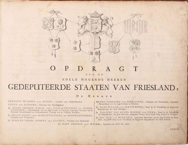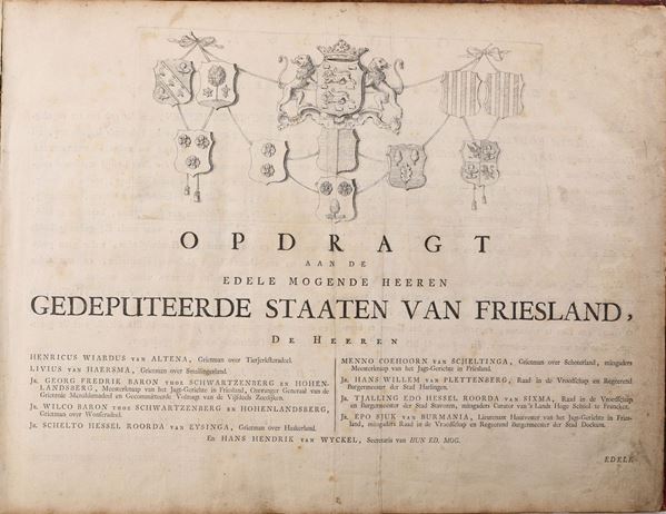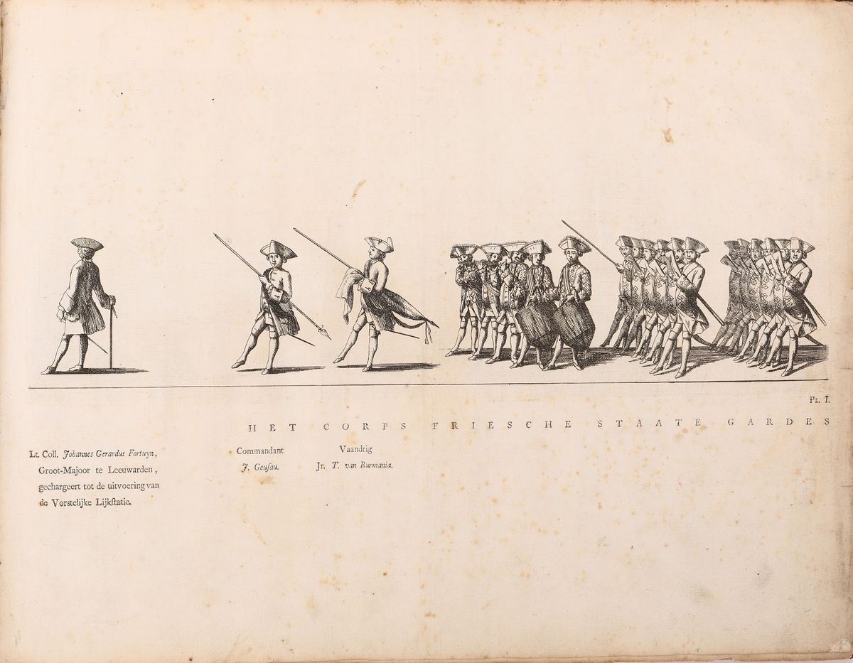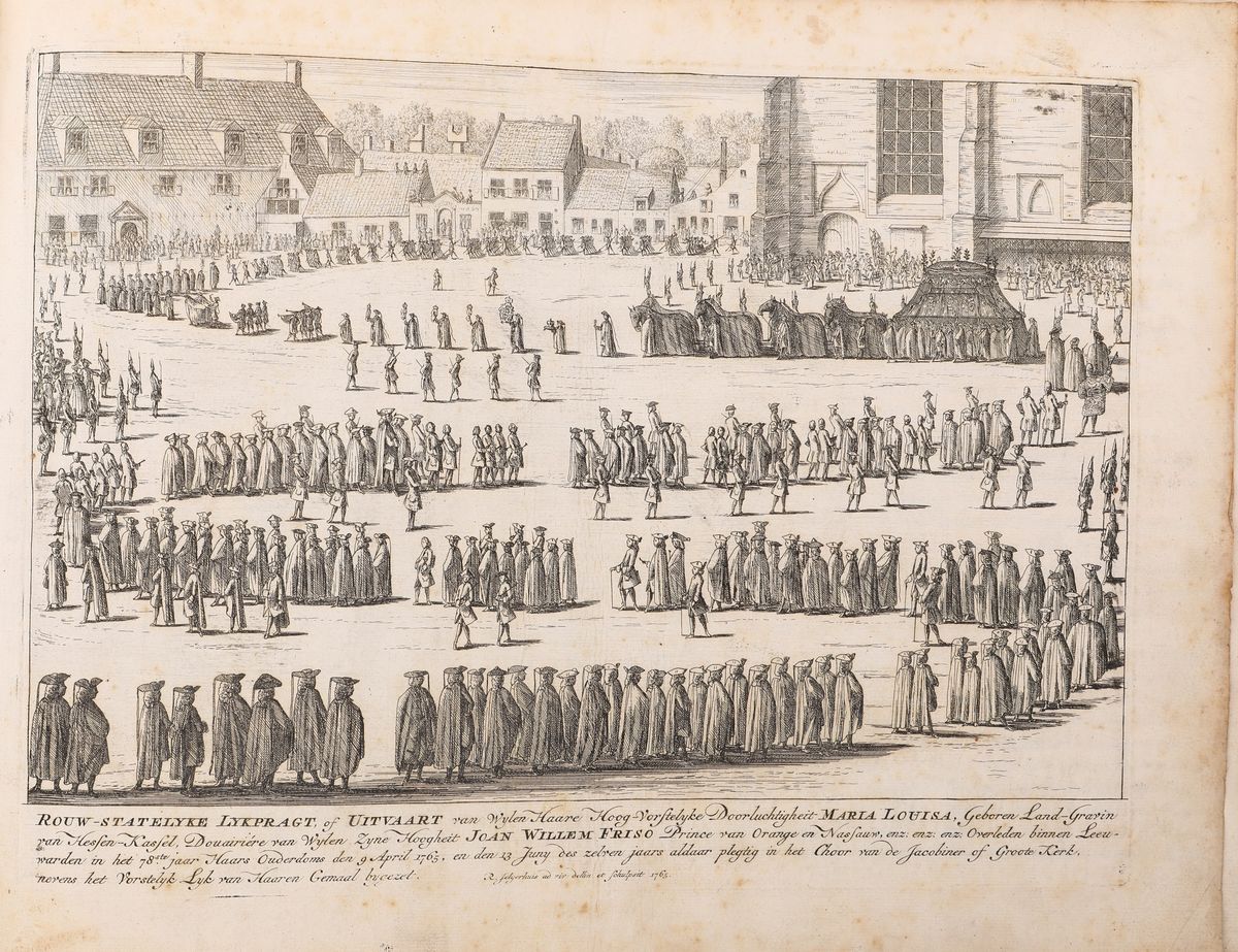 In folio. Formato oblungo. Rara copia completa di tutte le 22 tavole e pagine della pubblicazione realizzata in occasione dei solenni funerali di Maria Louisa von Hessen-Kassel (1688-1765) Tramite sposata con Giovanni Guglielmo Friso d'Orange, divenne principessa consorte d'Orange. Tenne la reggenza per due periodi nella storia olandese, durante i regni del figlio, Guglielmo IV, e del nipote, Guglielmo V. La serie delle tavole è composta da 21 numerate con numeri romani raffiguranti le varie sezioni del corteo funebre, i nomi e i ranghi dei partecipanti al seguito, a cui segue una tavola panoramica dell'intera processione. Legatura in mezza pelle del XIX secolo (difetti).