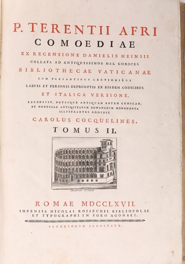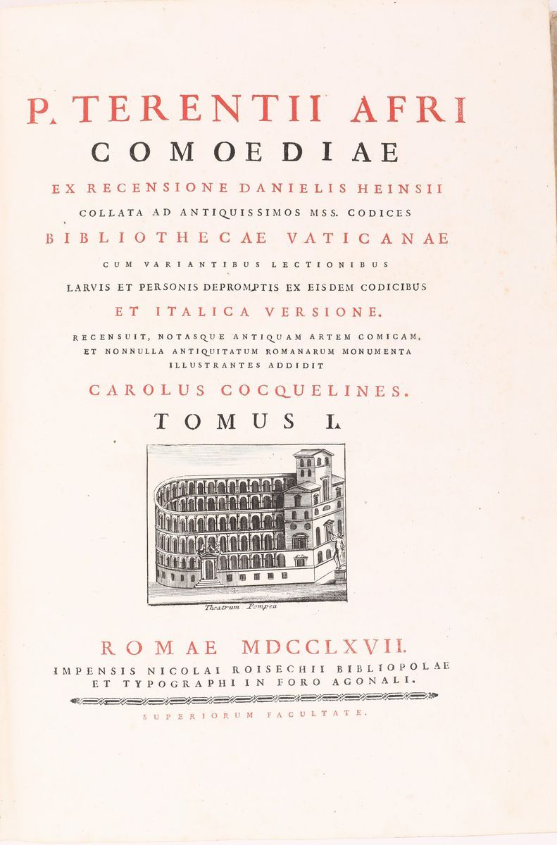 P. Terentii Afri. Comoediae ex recensione Danielis Heinsii Collata Ad Antiquissimos Mss. Codices Bibliothecae Vaticanae. Et Italica Versione. Recensuit, Notasque Antiquam Artem Comicam, Et Nonnulla Antiquitatum Romanarum Monumenta Illustrantes Addidit Carolus Cocquelines, Nicolò Roisecco, Roma 1767