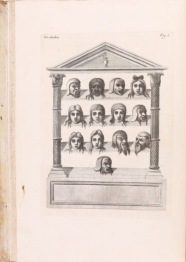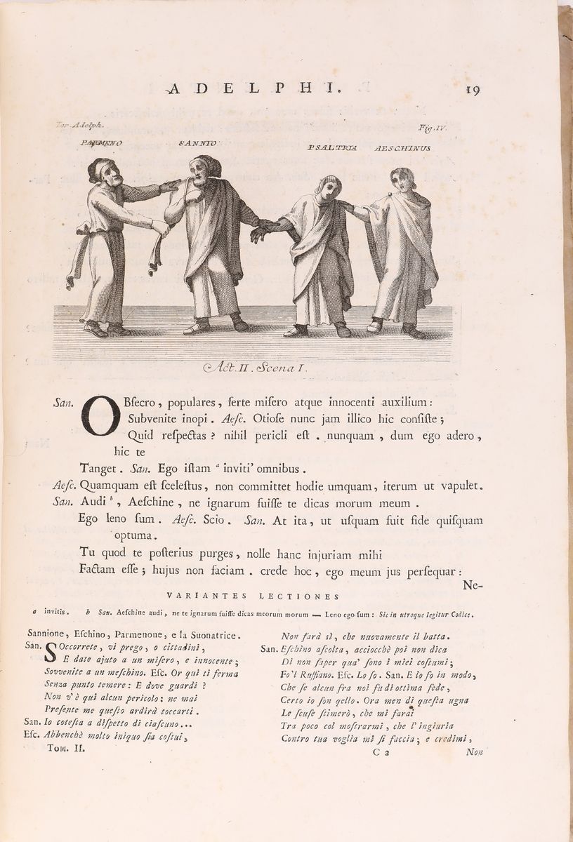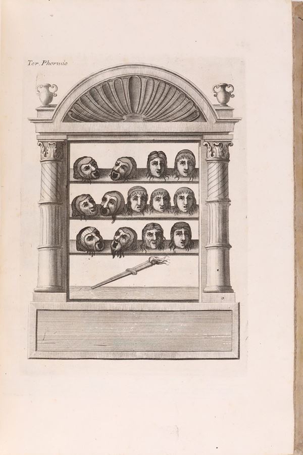 In Folio. 2 Volumi. Celebre ed affascinante edizione settecentesca illustrata da oltre 150 incisioni nel testo e a piena pagina delle commedie di Terenzio. Comprende: l'Adria, la Suocera, l'Eunuco, gli Adelphi, il Formione e il Punitore nel commento del filologo olandese Daniel Heinsius. Testo in latino ed italiano a fronte. Legature in piena pergamena coeva con fregi a secco ai piatti, titoli e fregi in oro ai dorsi con 7 nervi.