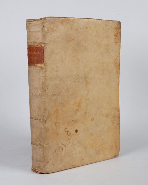 In 4° grande. Edizione settecentesca della celebre opera di procedura civile (prima ed. Roma 1659) del giureconsulto cortonese della metà del seicento. Questa monumentale opera divenne ben presto famosa e furono stampate molte altre edizioni anche nei secoli successivi. Piena pergamena coeva con 5 nervi e tassello con titolo in oro al dorso. Strappi e mancanze che ledono marginalmente il testo alle 2 carte dopo il frontespizio. Fioriture e macchie di umidità. Lotto non passibile di restituzione.