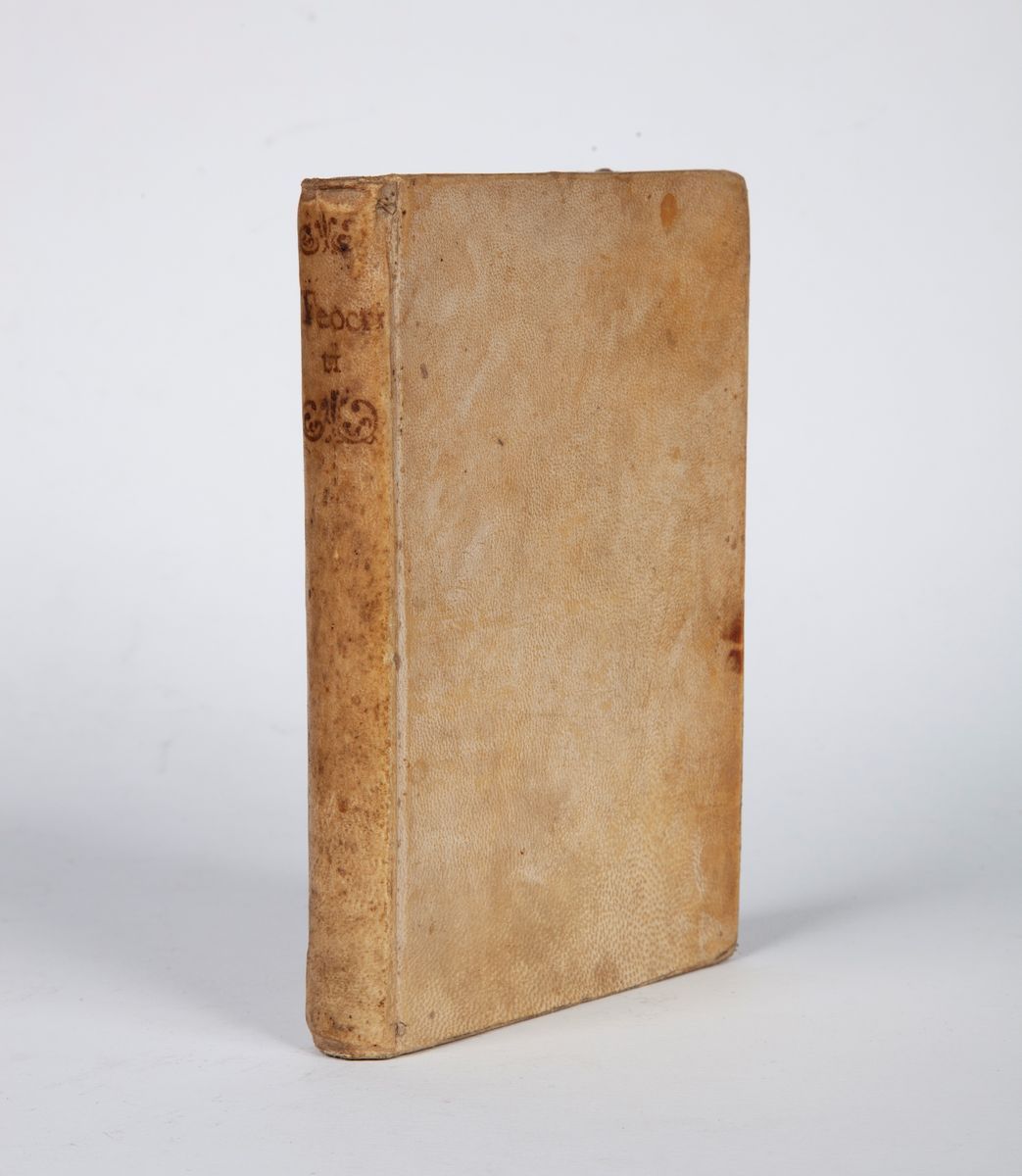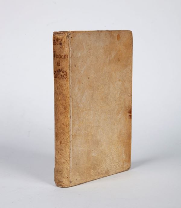 In 16°. Testo in latino degli idilli di Teocrito nella traduzione dell'umanista tedesco Hessus, giurista e medico, celebre per la perfezione delle sue poesie neolatine. Legatura in pergamena coeva rigida, titolo manoscritto al dorso, tagli color verde; foro di tarlo al frontespizio che non lede il testo.