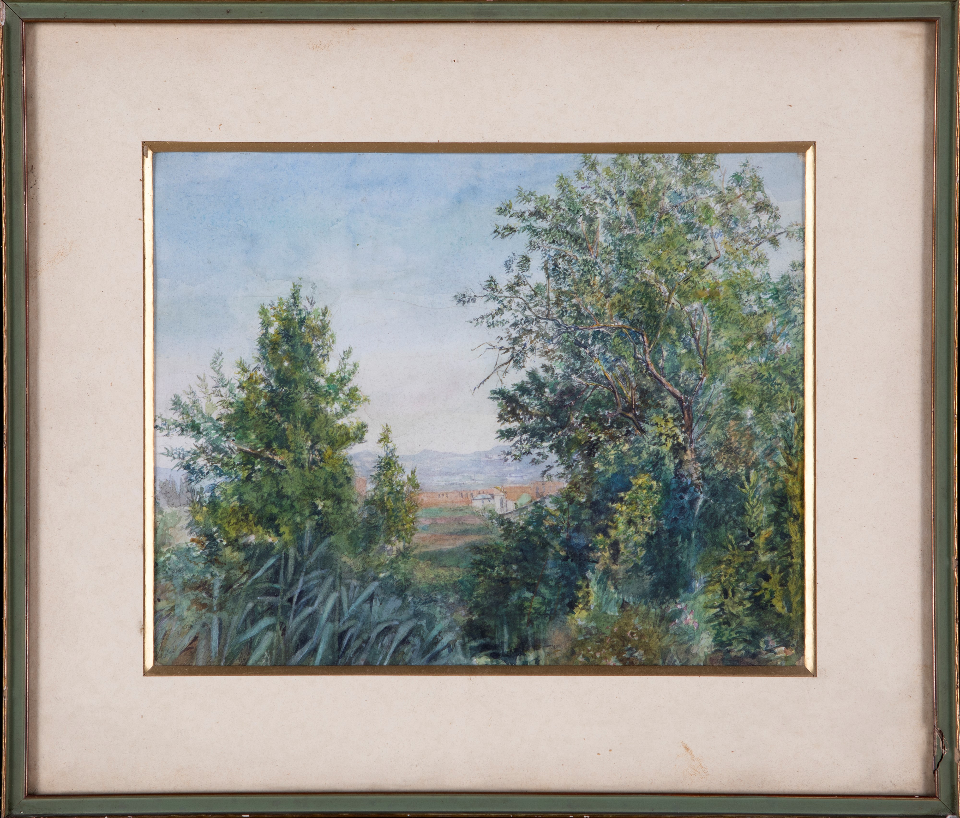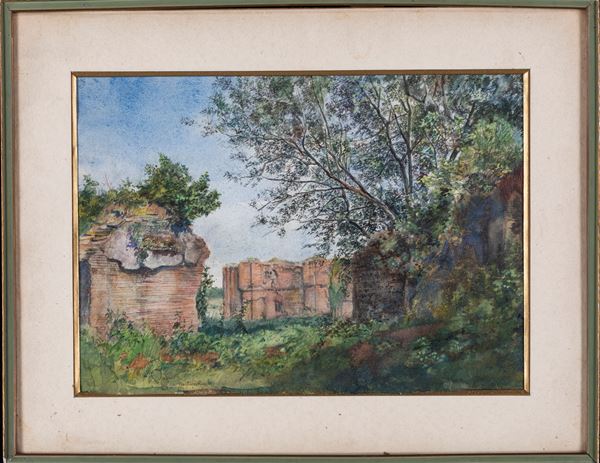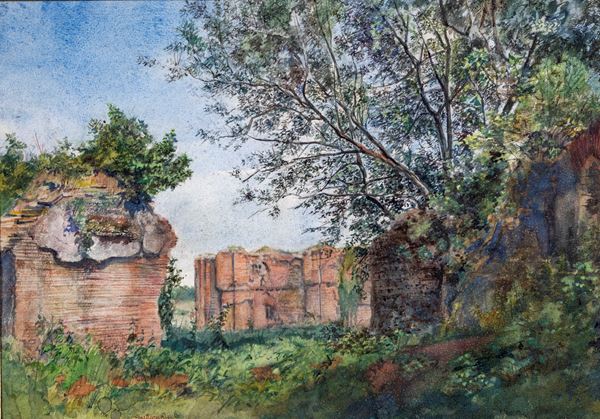 a) Paesaggio con rovine b) Paesaggio con paese in lontananza