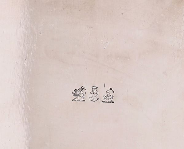 di forma ovale con manici e fitta decorazione incisa a volute, motivi vegetali e fiori; orlo sottolineato da tralci di vite e pampini