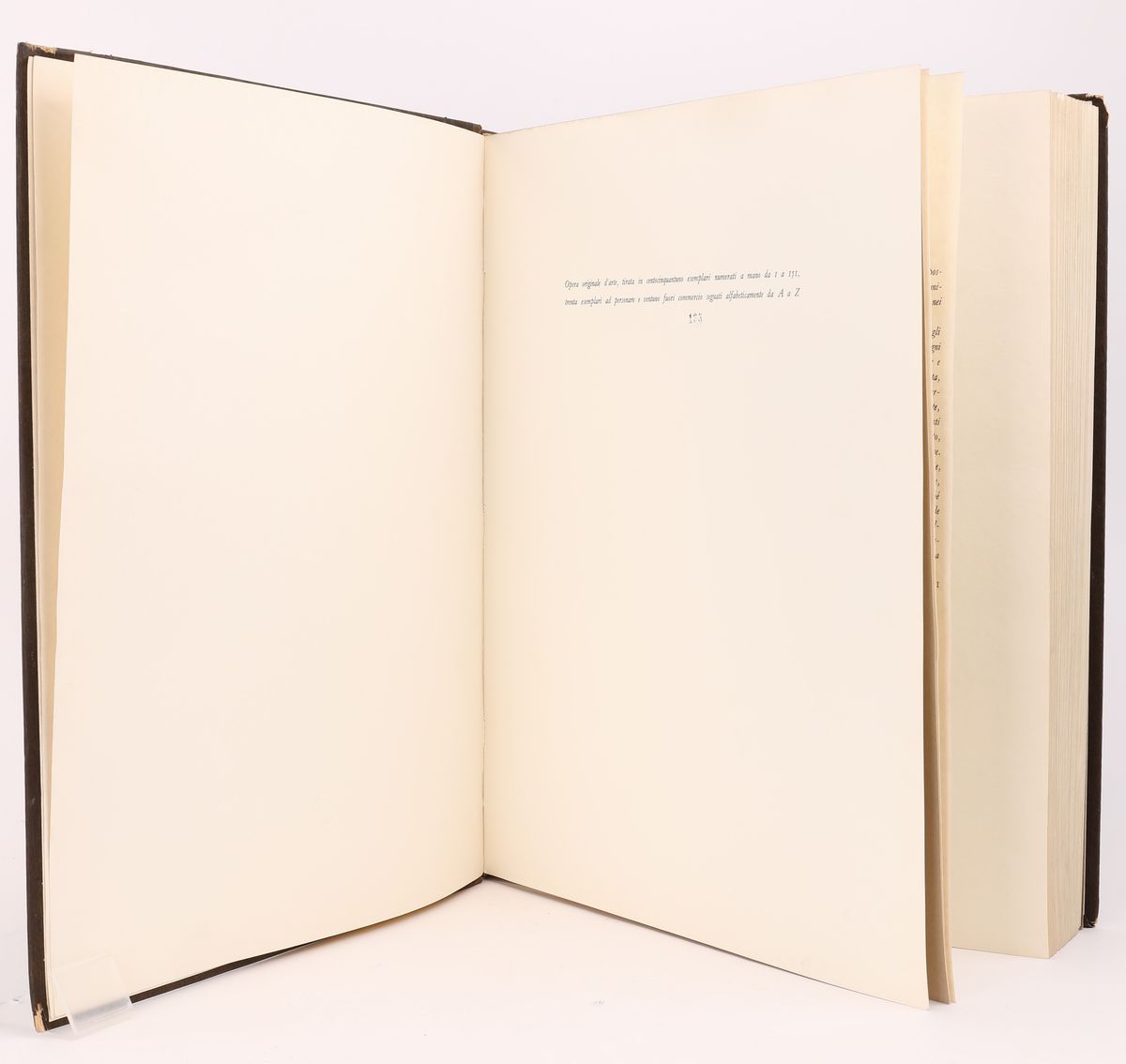 Tiratura limitata in 151 esemplari numerati a mano di cui 30 esemplari ad personam, Ns esemplare n.135. Stampato su carta appositamente fabbricata dalla Cartiera Ventura. Legatura eseguita da Conti Borbone in legno jacaranda con titoli in oro al dorso e fregio in oro al piatto su disegno del pittore Osvaldo Carrara. Mancante la litografia Tavola 14. Lotto non passibile di restituzione.