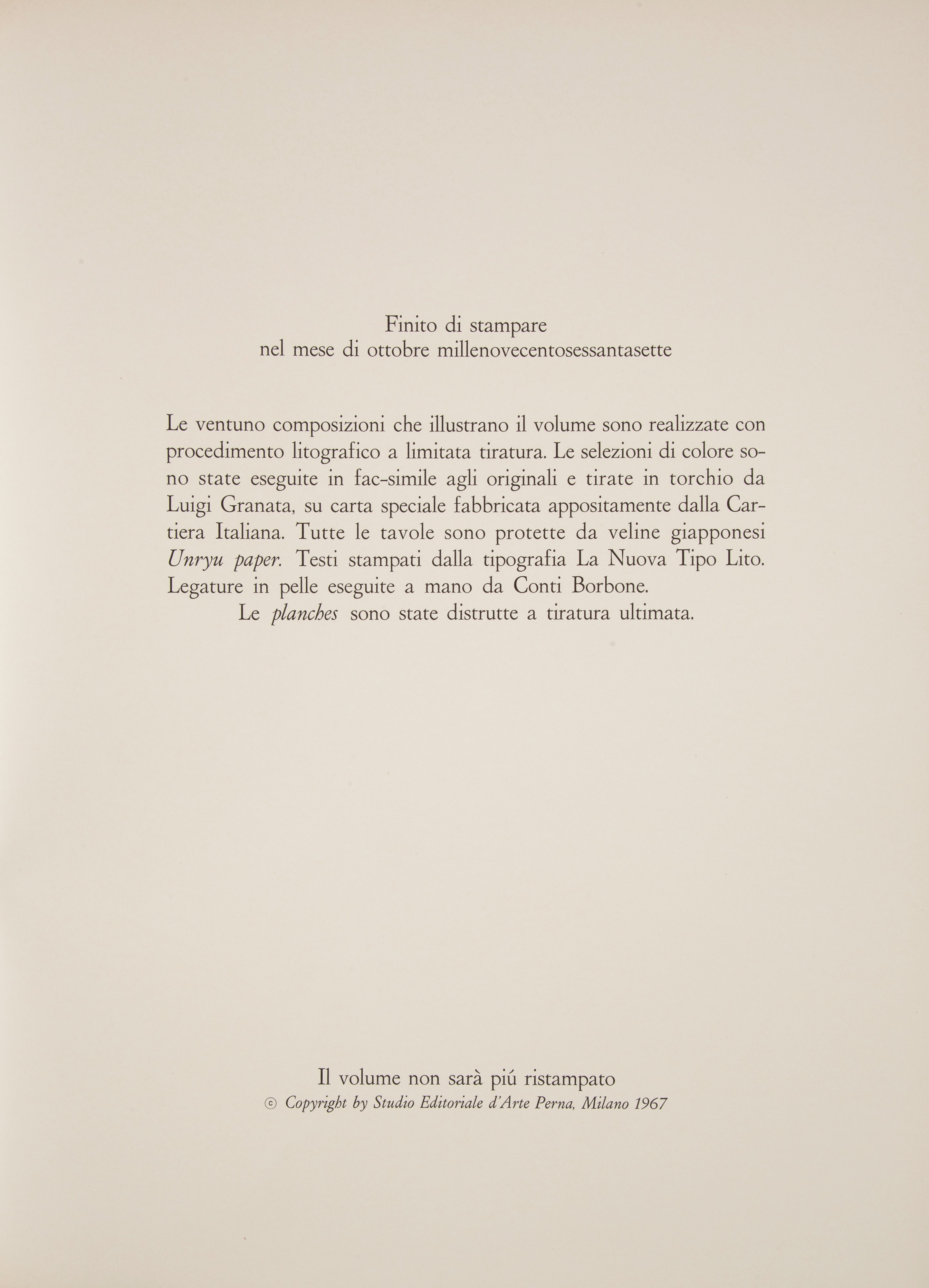 Tiratura limitata in 1.100 esemplari numerati, ns n.314. Tavole tirate al torchio da Luigi Granata su carta speciale della Cartiera Italiana. Note critiche di Elda Fezzi. Legatura in pelle eseguita a mano da Conti Borbone con titoli in oro al piatto e al dorso. Entro cofanetto editoriale rivestito in pelle.