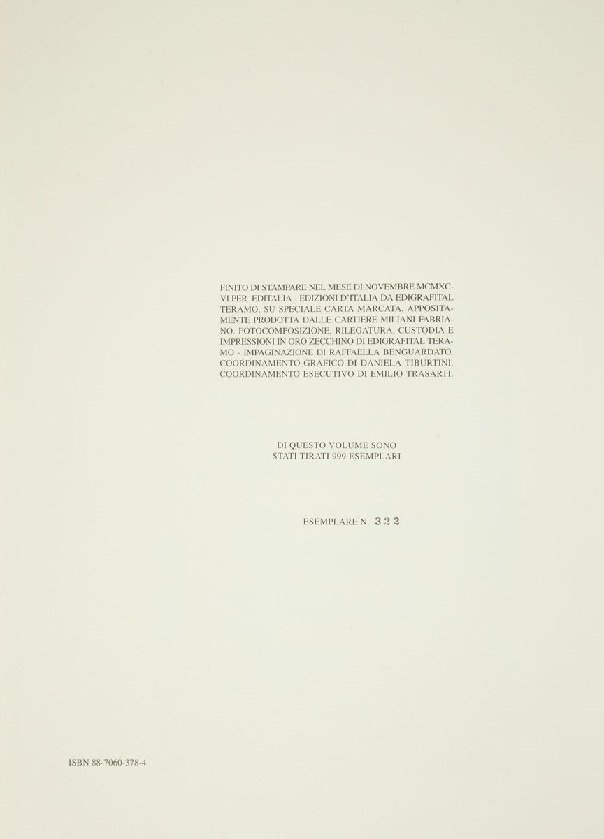 Tiratura limitata in 999 esemplari, ns n.322. Con 100 incisioni. Legatura in pelle primo fiore della ditta "Antinori", con impressioni in oro zecchino sul piatto e sul dorso. Stampata su carta speciale "Cartiere Miliani Fabriano". Custodia in pelle con stampa. Come nuovo.