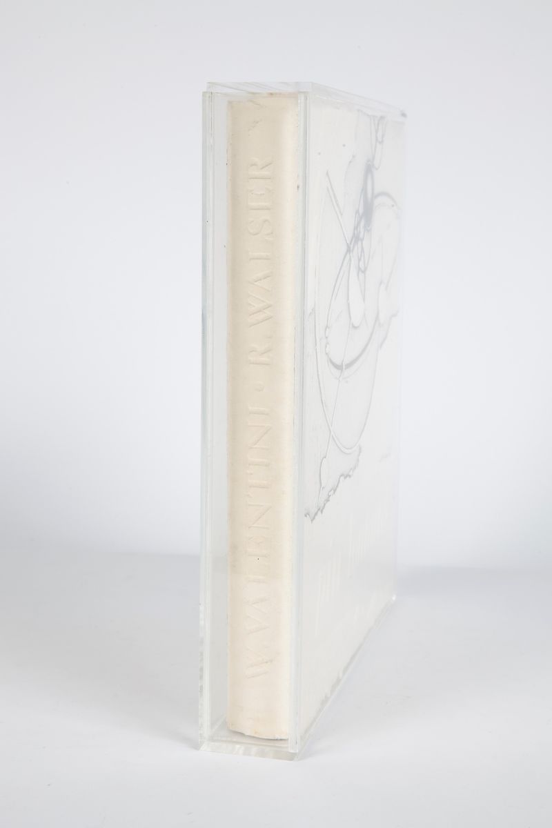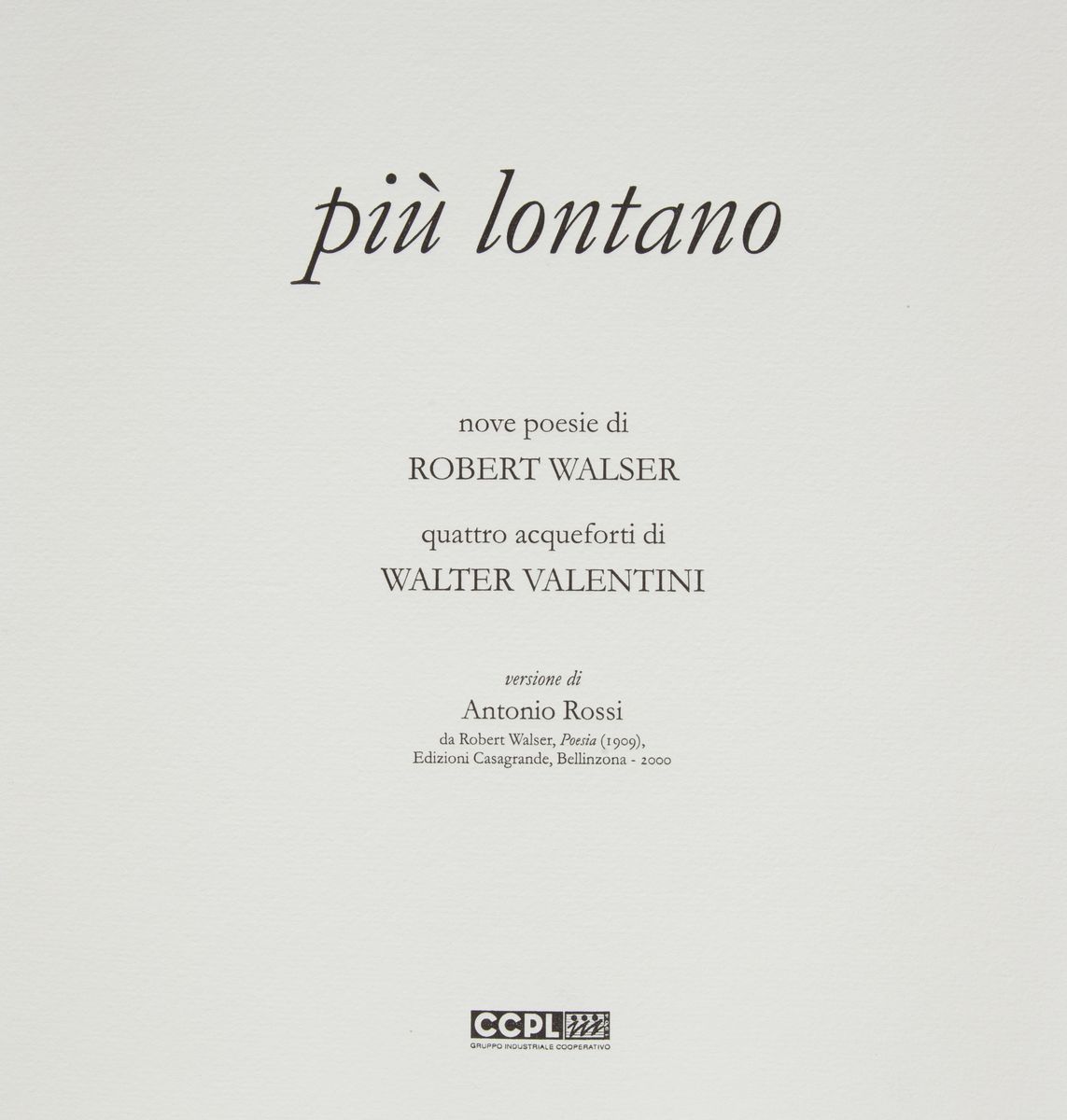 Nove poesie di Robert Walser nella versione di Antonio Rossi, quattro acqueforti di Water Valentini firmate e numerate dall'autore impresse sui torchi di Giancarlo Sardella di Milano. Opera realizzata in 140 esemplari di cui 100 in numeri arabi e 40 in numeri romani (ns. esemplare XVI/XL). Copertina stampata su carta realizzata a mano in cotone naturale con incisione a rilievo firmata dall'artista. Entro custodia in plexiglass di Giorgio Cazzaniga.