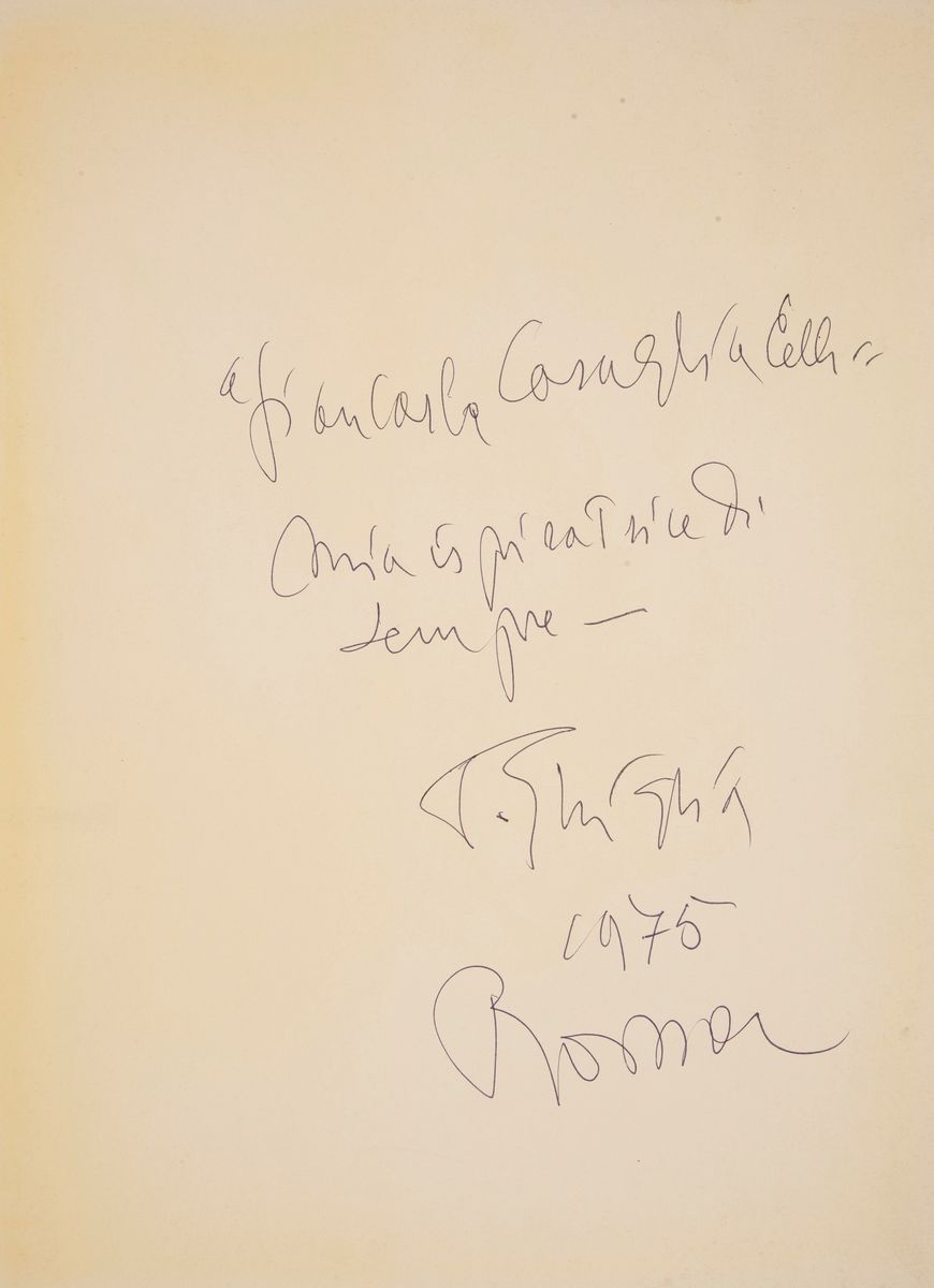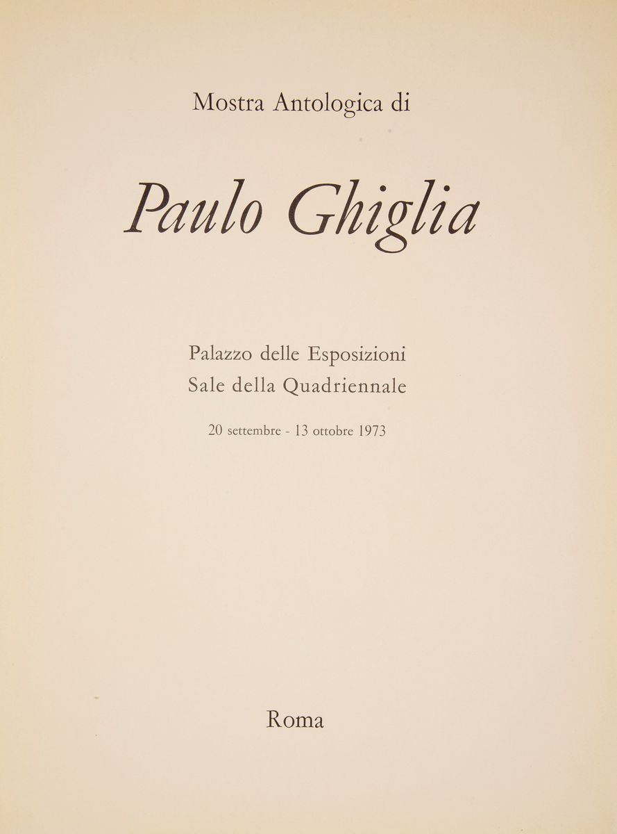 Catalogo della mostra Palazzo delle esposizioni, Sale della quadriennale, 20 settembre-13 ottobre 1973. Testo di Valerio Mariani. Dedica autografa di Paulo Ghiglia datata Roma 1975. Tracce di umidità che non ledono né il testo né le foto.