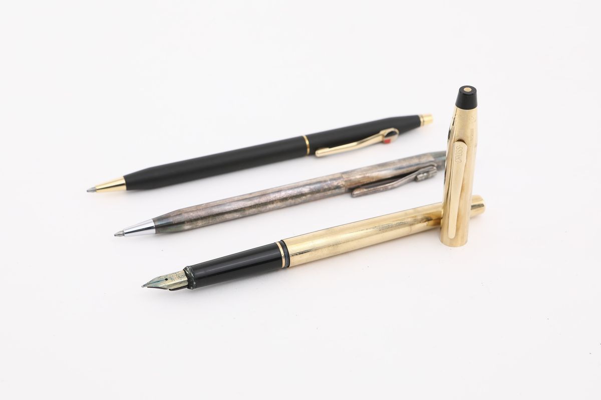 1- Penna stilografica in metallo dorato, pennino M in oro giallo 14 kt. Con istruzioni. Entro astuccio Cross non pertinente