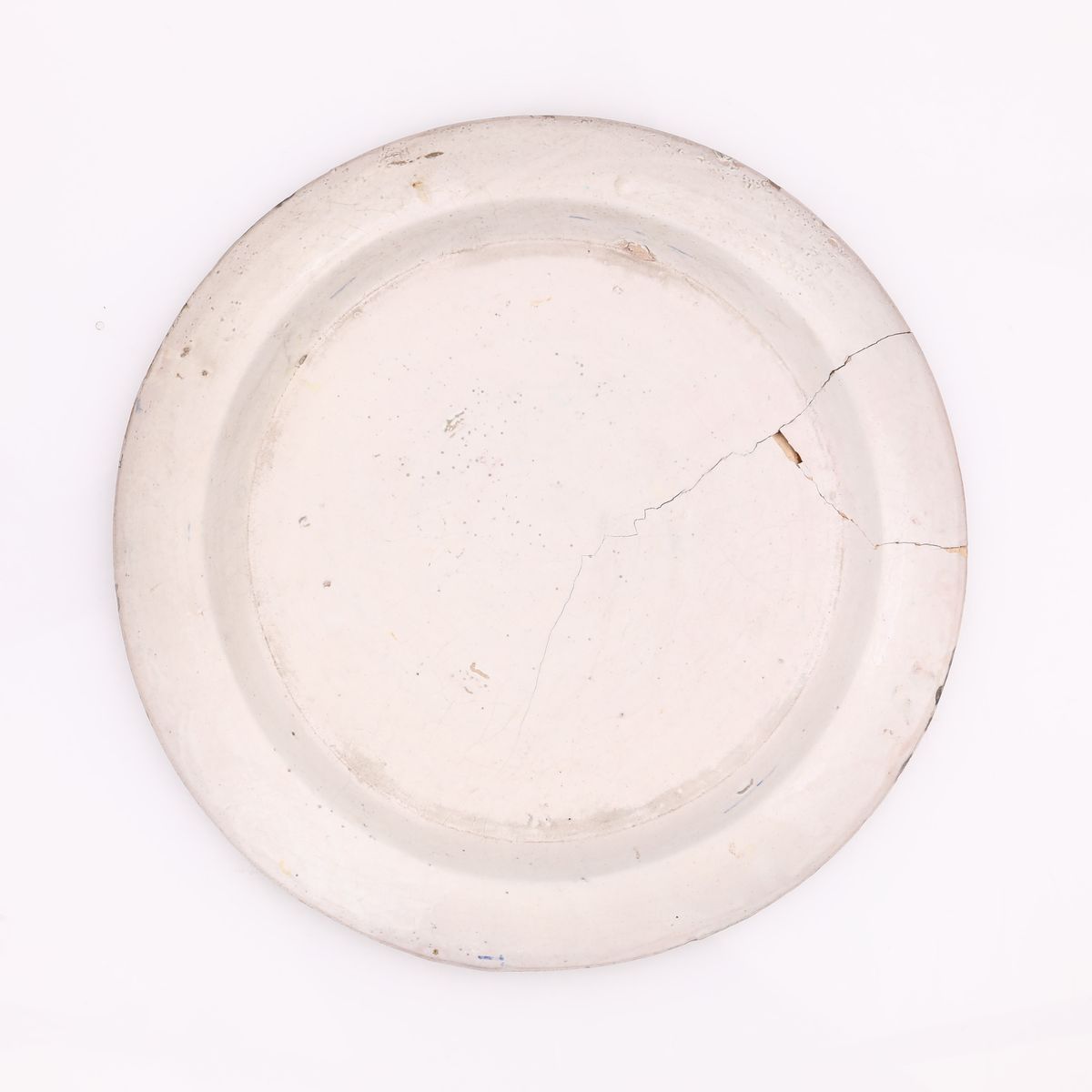 decorato a pennello in blu, giallo, verde, ocra e manganese con un paesaggio minimo con albero spoglio centrale; tesa percorsa da sfere centrate da un punto. Rotture