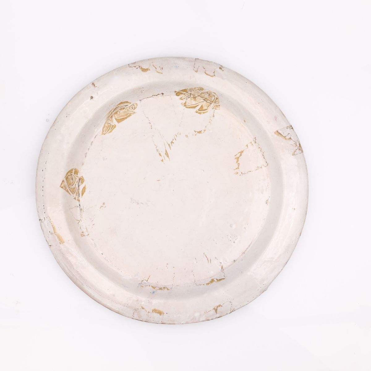 decorato a mascherina, spugna e pennello con un fiore centrale blu entro anelli gialli racchiusi entro un'ampia bordura