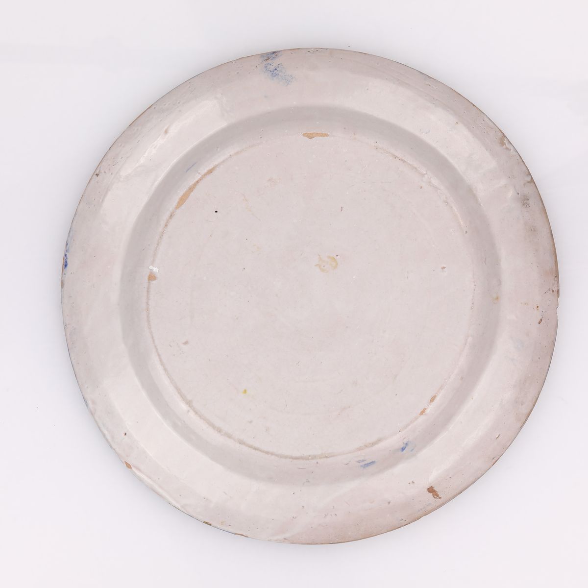 centrato da una corolla blu e verde i cui petali sono alternati a semicorolle giallo e ocra entro anello nei medesimi toni cromatici; tesa con ghirigori blu a stampino. Sbeccatura lungo il bordo