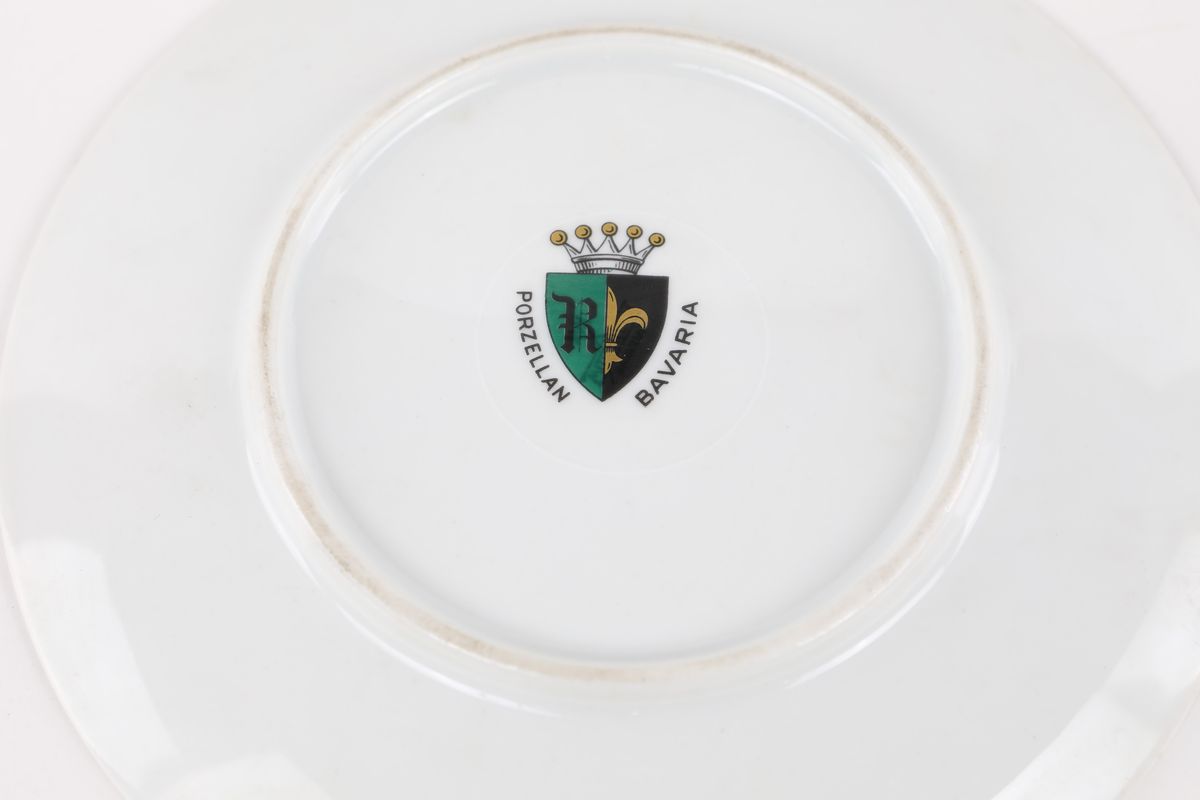 composto da 36 piatti piani, 12 fondi e 12 da frutta, un piatto da portata circolare e tre ovali di diversa misura, due raviere, tre ciotole di diversa misura, una zuppiera con coperchio e una salsiera con piatto (sbreccato); ogni elemento è decorato lungo la tesa da esili tralci grigi con corolle dorate