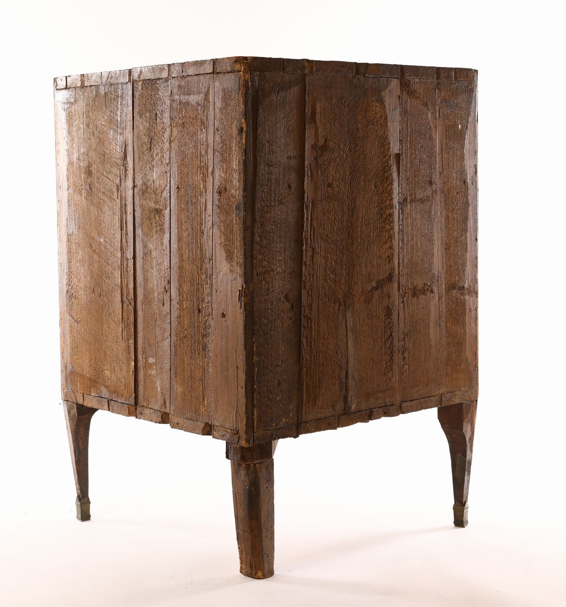 con facciata sagomata impiallacciata a spina di pesce, scandita da tre cassetti con bocchette e maniglie in bronzo; piano sagomato con ciglio modanato in marmo broccatello di Spagna, piedi rastremati