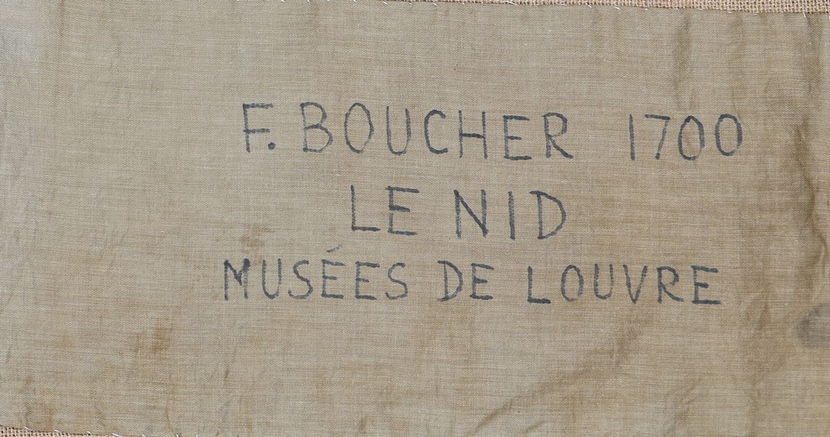 raffigurante "I regali del pastore" (o "Il nido") da Francois Boucher. Iscritto al verso F. Boucher - Le Nid - Musée de Louvre