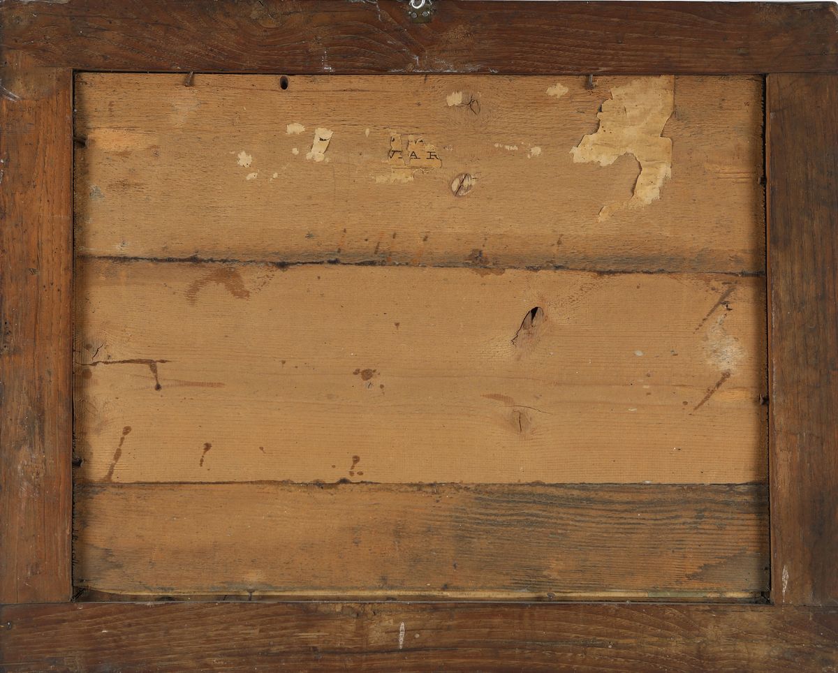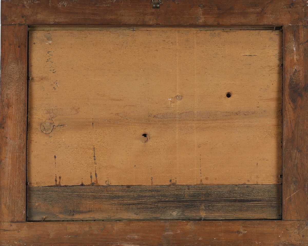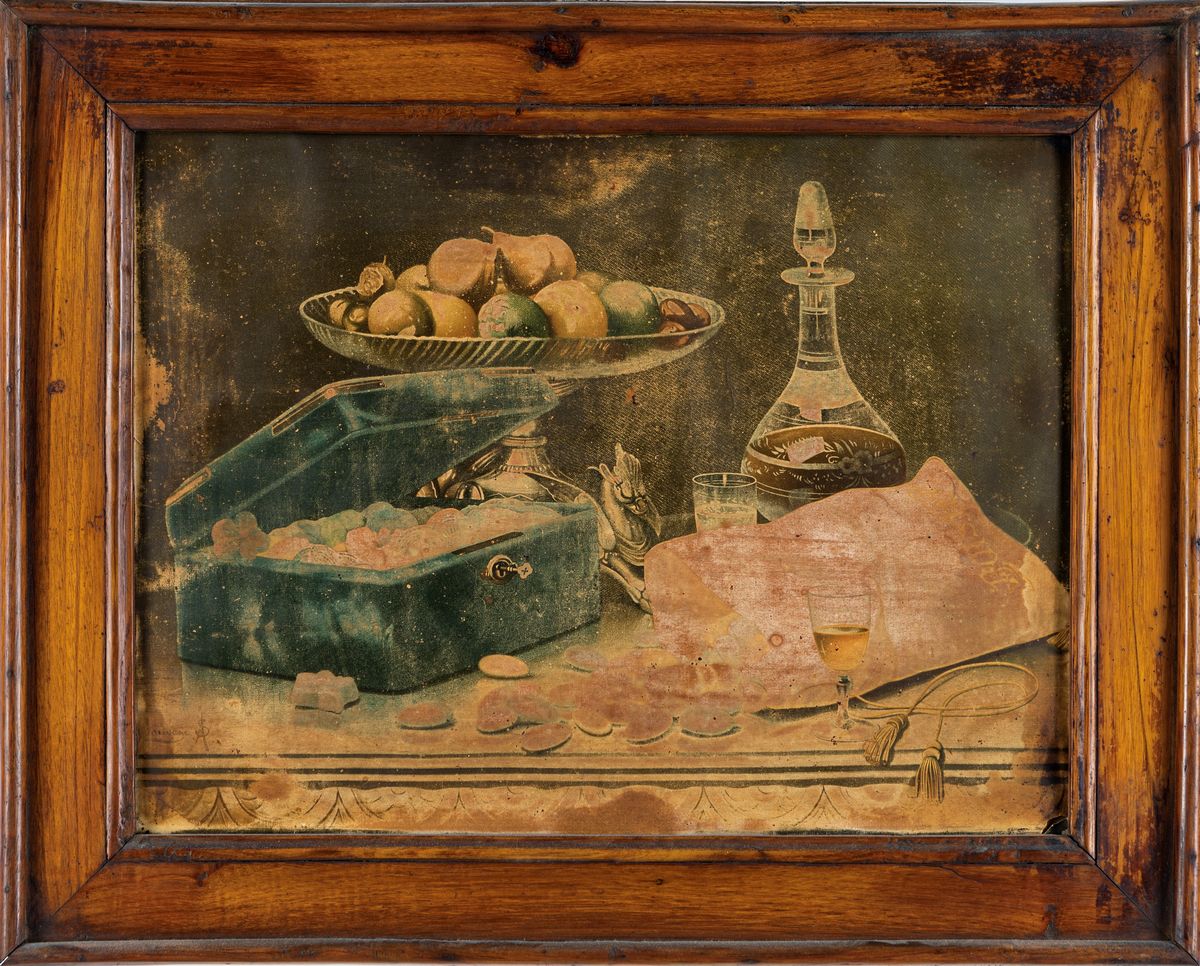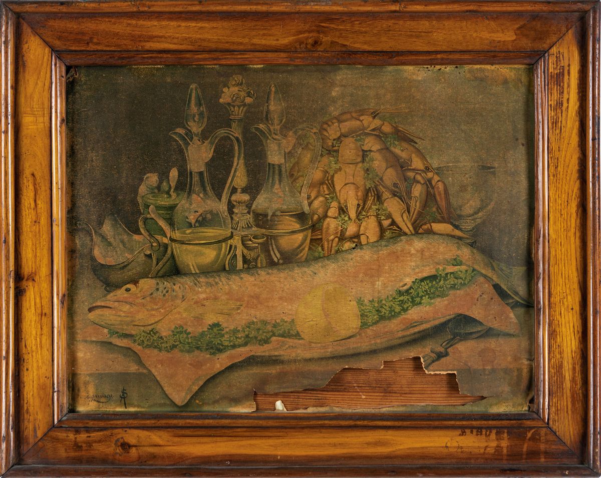 a fascia liscia delimitata da cordolo e da profilo interno modanato; all'interno riproduzioni su carta raffiguranti nature morte (danneggiate)