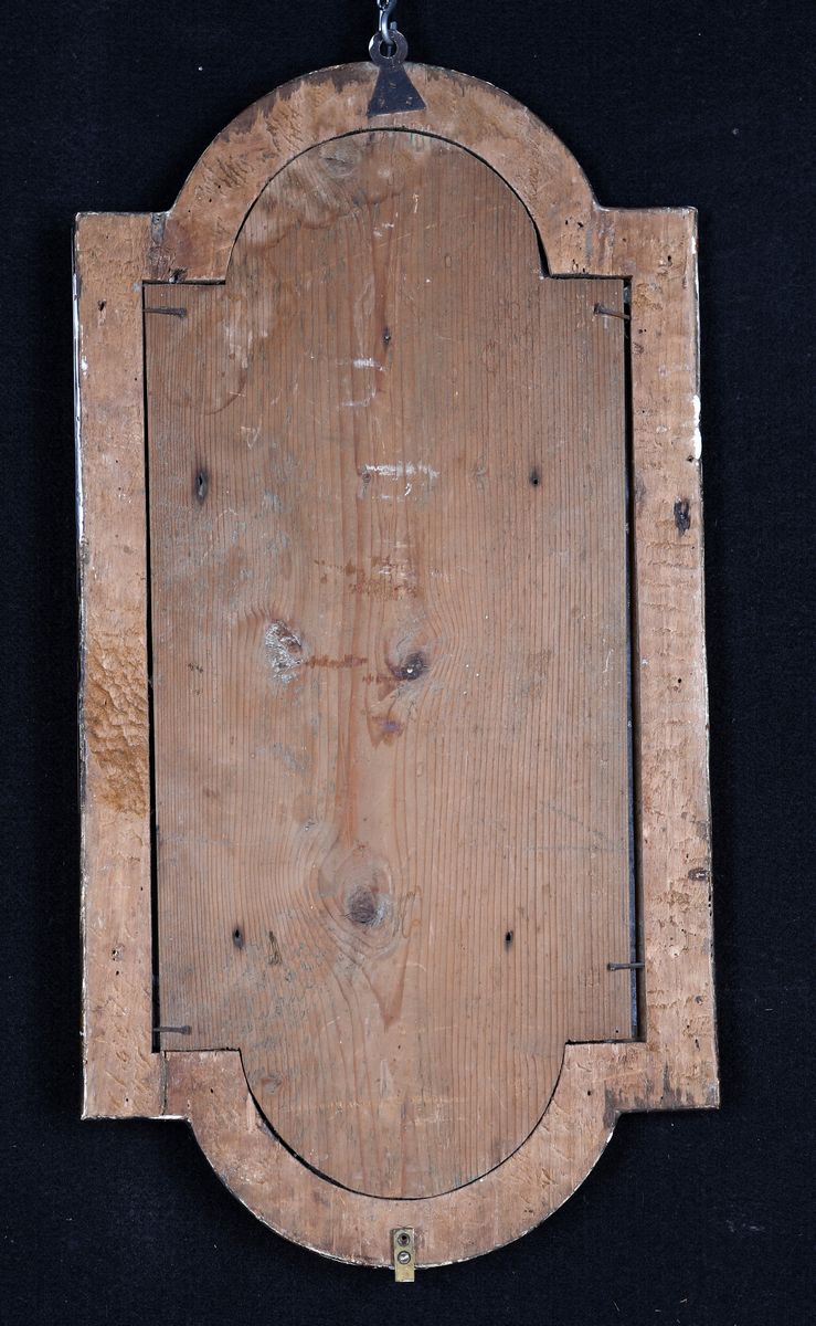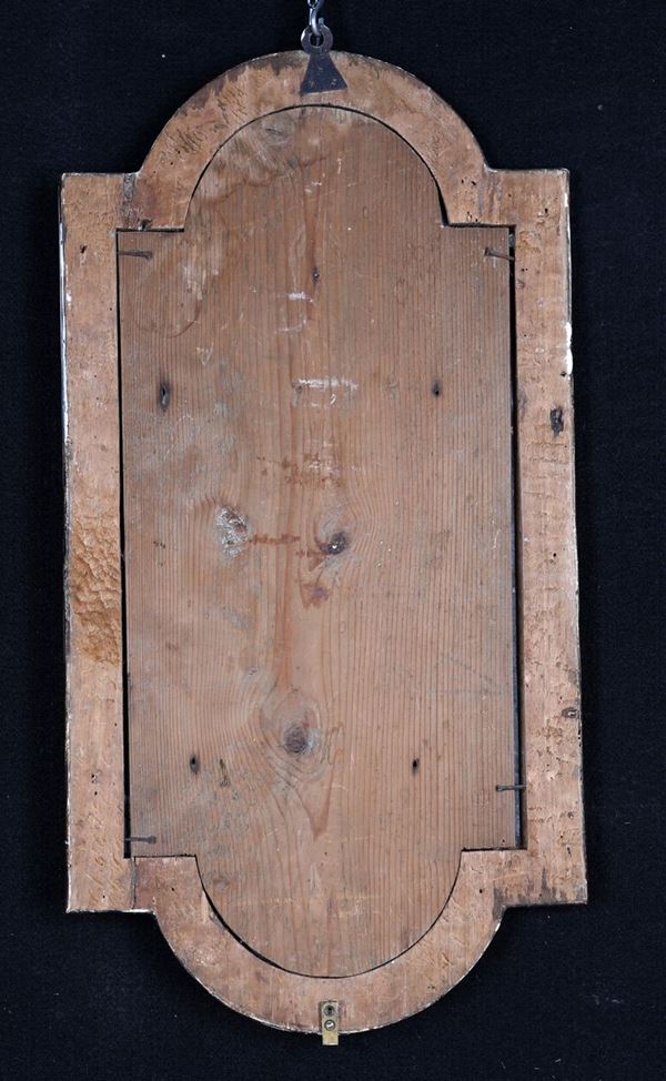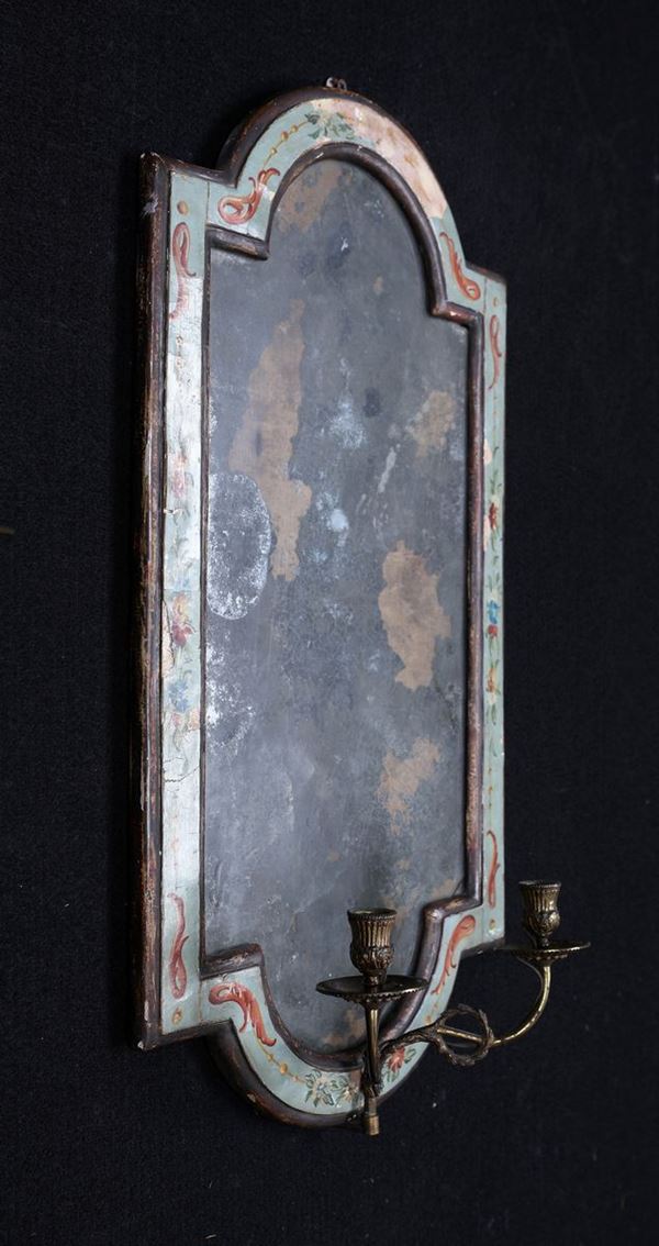 con vertici centinati e cornici decorate da cascatelle fiorite dipinte nei toni del rosso, dell'azzurro e del verde; dal centro del lato inferiore si dipartono due braccetti reggicandela. Difetti e mancanze