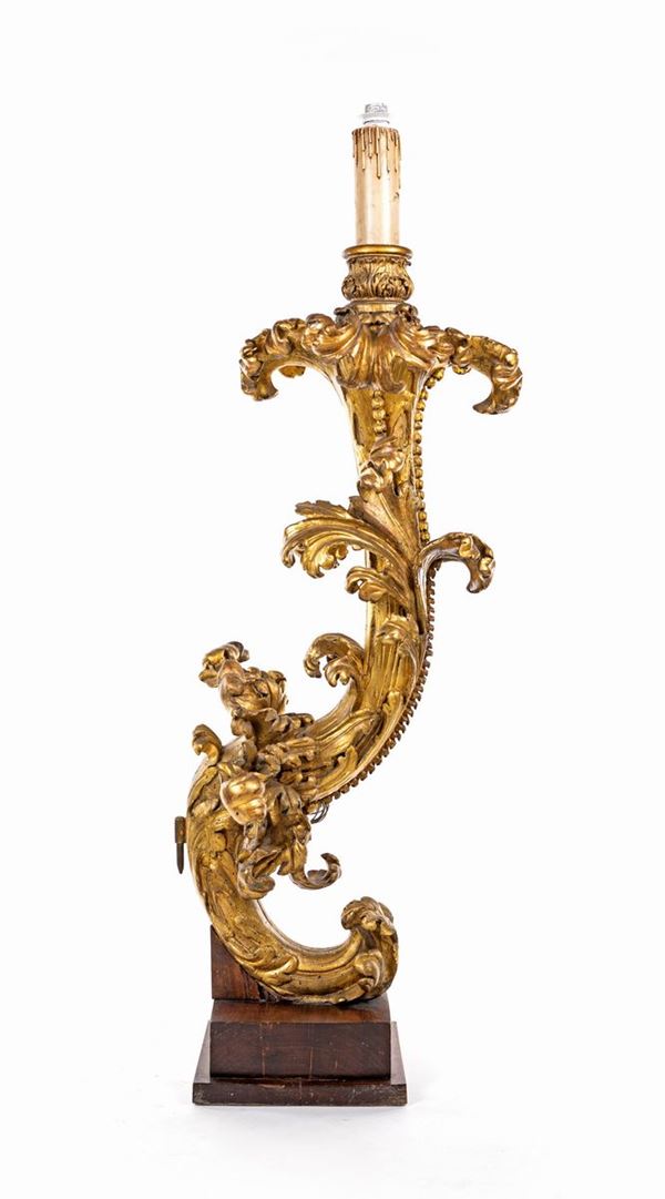 a forma di cornucopia con estremità inferiore a ricciolo, abbellita da rilievi vegetali variamente ricurvi e cascatelle di piccoli boccioli; base squadrata in legno naturale