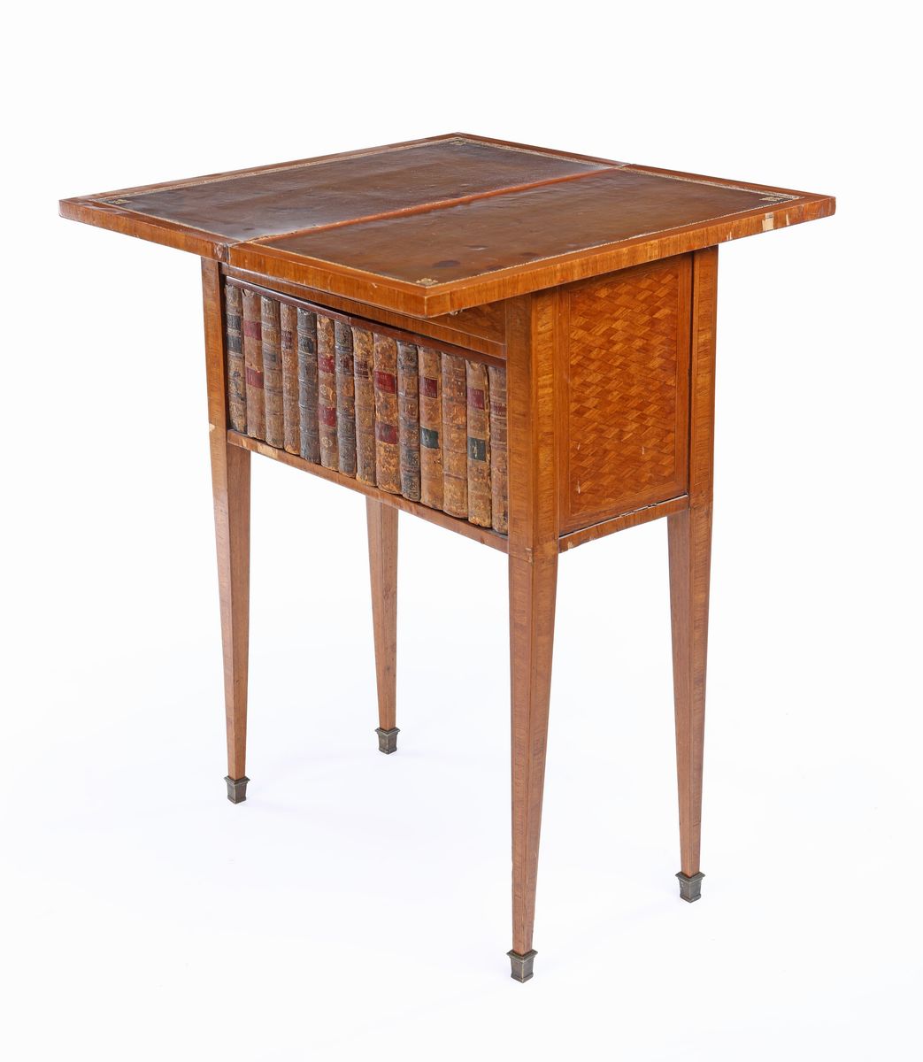 con piano a libretto rivestito in pelle, facciata scandita da un tiretto e due ante caratterizzate da dorsi di libro in cuoio con titoli impressi; gambe rastremate calzate di puntali in ottone