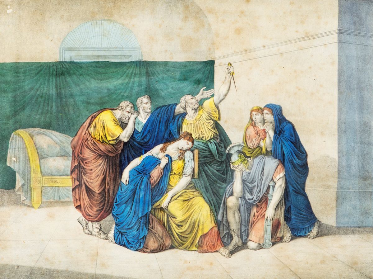 a) Le più illustri famiglie della Città di Faleria stringono al loro seno li propri figli mediante la generazione di Furio Camillo che li rimanda liberi alla propria patria dandogli libertà di battere con verghe il loro maestro che con simulata perfidia li avea condotti al campo dei Romani per farli restare prigionieri b) Bruto giura di vendicare la morte di Lucrezia discacciando la Famiglia dei Tarquini da Roma