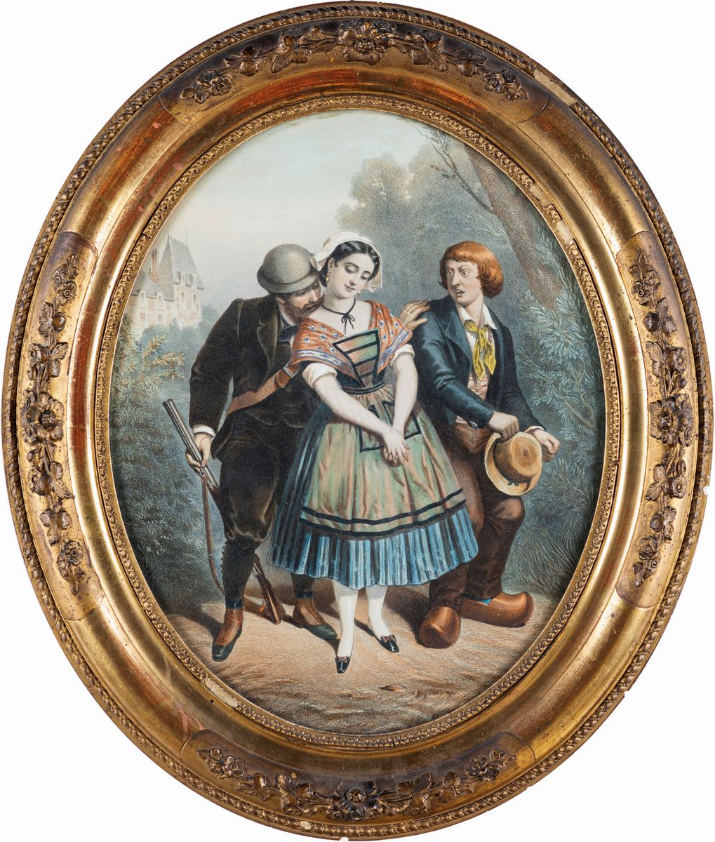 Tre allegorie di scene galanti entro cornici in legno dorato impreziosite da rilievi vegetali in pastiglia. Al verso presentano etichette d'epoca trilingue (francese, spagnolo, inglese) che illustrano i detti: a) Rira bien qui rira le derrier b) Attention dangereuse c) À tout seigneur tout honneur