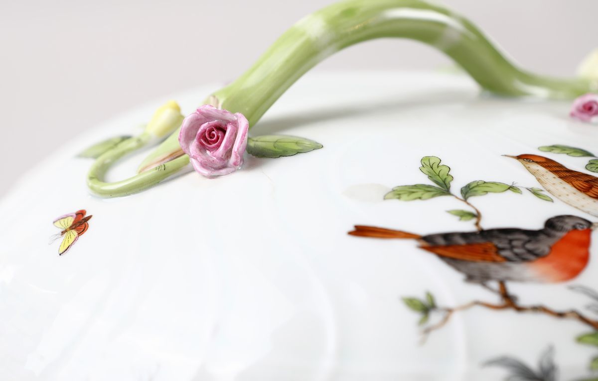 composto da dodici piatti fondi (cm 4,5x24), ventiquattro piani (diam. cm 26) e dodici da frutta (diam. cm 21), una grande zuppiera ovale con manici e coperchio (cm 26x37x26), una legumiera circolare con manici e coperchio (cm 15x29x26), una salsiera biansata con vassoio (cm 8,5x26x21), un mestolo (cm 24), due raviere a forma di foglia (cm 6x20x17) ed un piattino ovale (cm 26,5x21), due piatti da portata ovali di diversa misura (cm 38,5x28,5 e cm 42x32) e due circolari di diverso diametro (cm 35 e cm 38), dieci tazze biansate da consommé con dodici coperchi sormontati da un bocciolo (cm 10x12x8) ed altrettanti piattini (diam. cm 14,3). Tutti gli esemplari del servizio sono profilati in oro zecchino e decorati a mano con dodici specie di uccelli ritratti singolarmente o in coppia appoggiati ad un ramo d’albero stilizzato posto su un piccolo fazzoletto d’erba, circondati da piccole farfalle e insetti sparsi, motivi questi ultimi ripresi al verso dei piatti caratterizzati da tesa modellata in rilievo ad imitazione del vimini intrecciato. Marca in blu con stemma Herend Hungary, Handpainted con diversi numeri in blu o in cavo. Una fondina reca una piccola sbeccatura lungo il bordo.