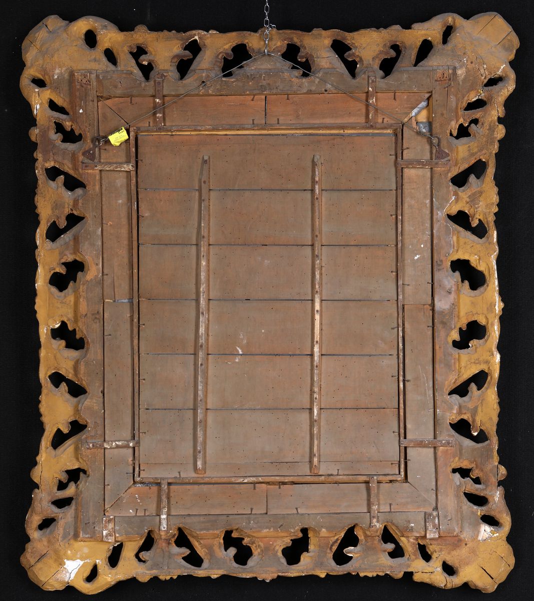 con cornice rettangolare costituita da volute e motivi vegetali traforati, caratterizzata da mascheroni angolari; specchio di epoca posteriore