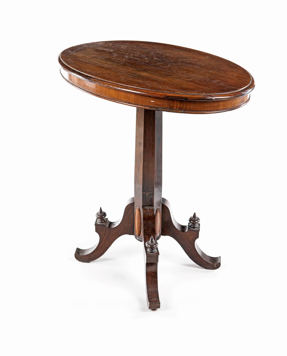 con piano ovale sorretto da un montante poliedrico poggiante su quattro piedi sagomati