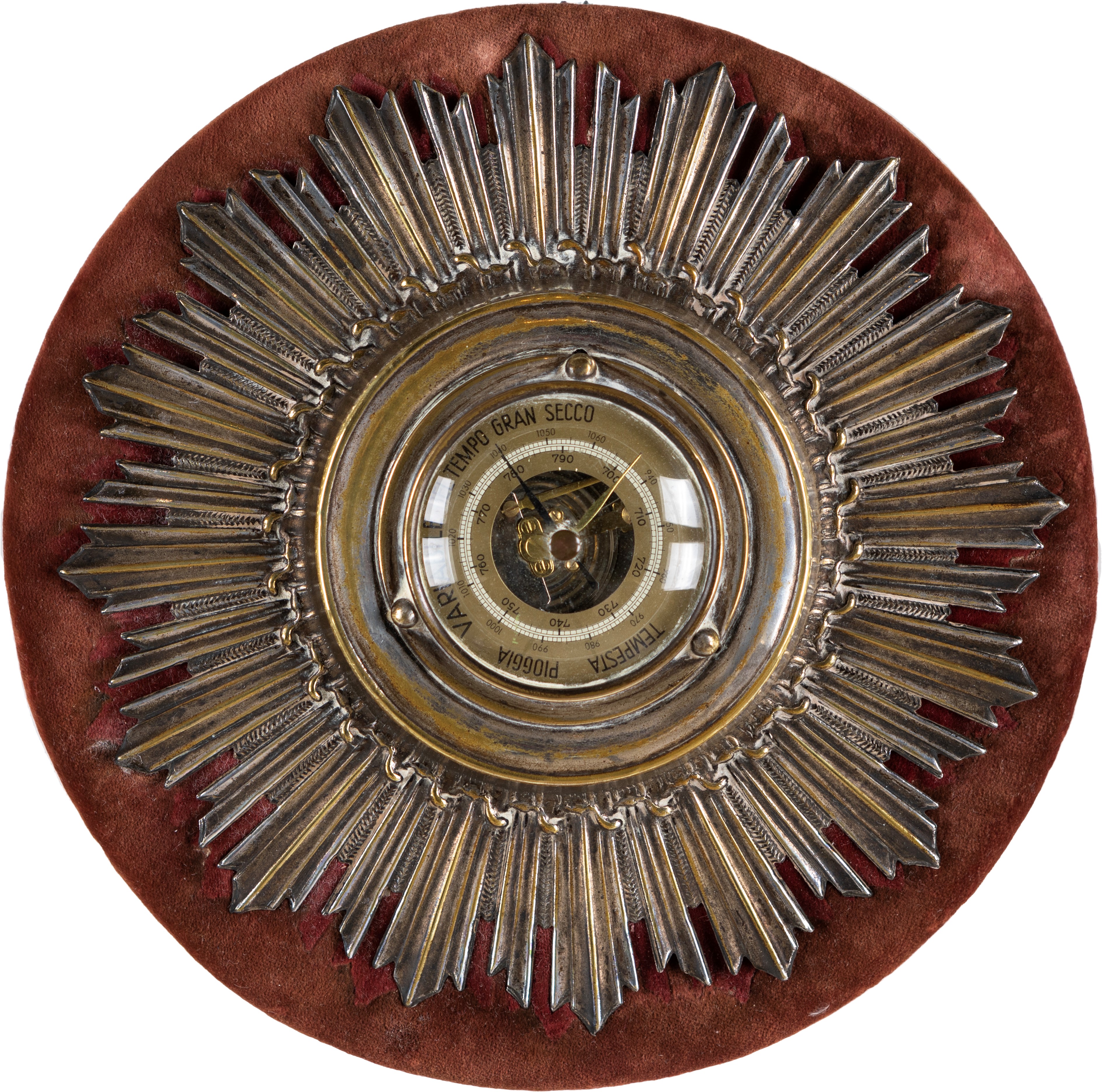 con quadrante circolare entro ampia cornice a raggiera; il termometro con gradi Celsius indicati a numeri arabi, iscritto made in Western Germany; il barometro con indicazioni climatiche in italiano è Made in Germany