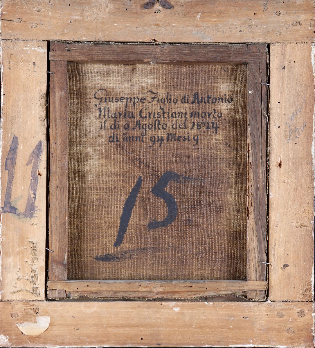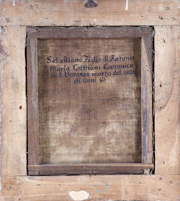 Recano rispettivamente iscritto al verso: "Giuseppe, figlio di di Antonio Maria Cristiani, morto il di 9 Agosto 1824 di anni 94, mesi 9" e "Sebastiano, figlio di Antonio Maria Cristiani Canonico in S. Venanzo morto del 1804 di anni 86"