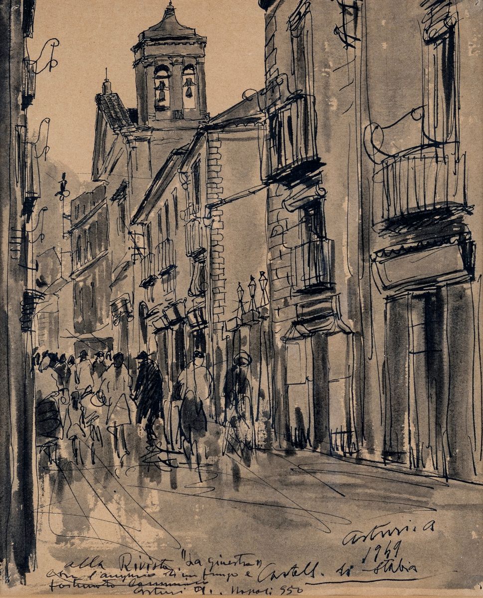 Firmato e situato in basso a destra: "Asturi A. / 1949 / Castell. di Stabia/ alla Rivista "La Giostra". Dedica in basso a sinistra: "alla Rivista "La Giostra" / con l'augurio di un lungo / e fortunato cammino / Asturi A. Napoli 950".