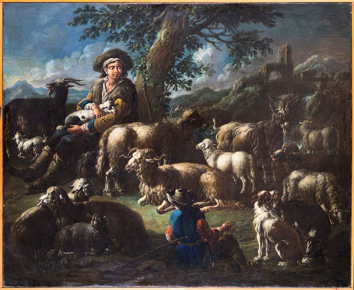 Paesaggio con giovani pastori e animali al pascolo
