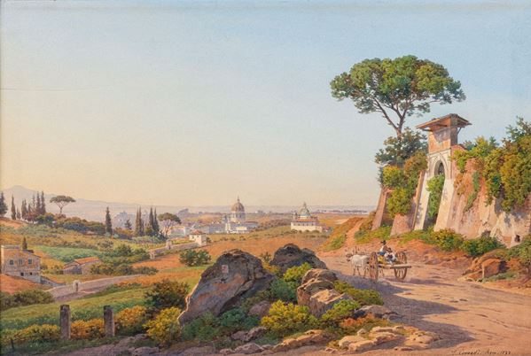 Firma e data in basso a destra "S.Corrodi Rom. 1873". Al verso, nell'incorniciatura, è conservata una parte del vecchio retro del quadro con biglietto ottocentesco che ricorda i dati biografici e la fortuna dell'autore. Il quadro rappresenta una veduta di San Pietro dalla via Trionfale, specularmente rispetto alla visione dal vero.