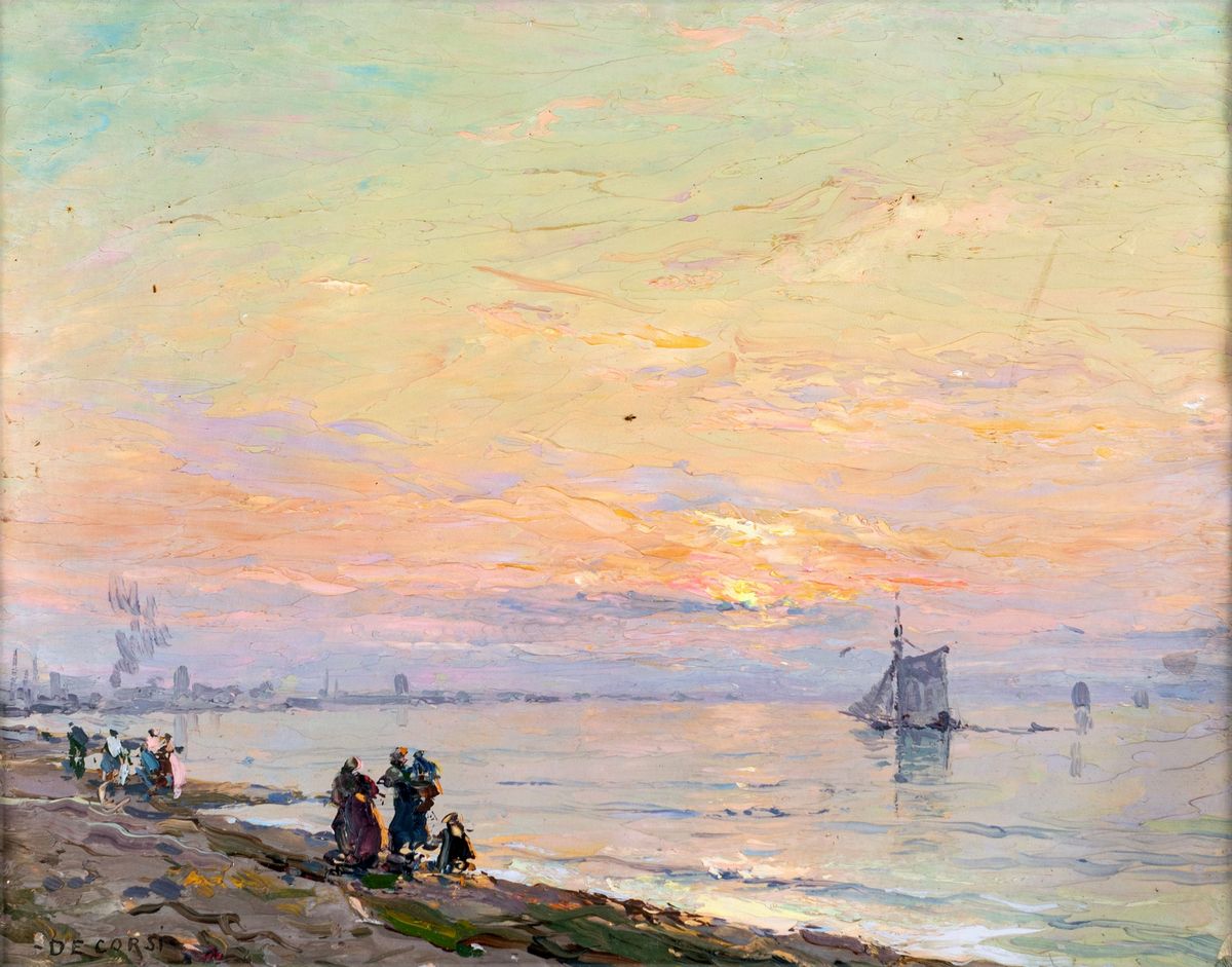 Marina con personaggi e scorcio di città, anni '30 del XX secolo