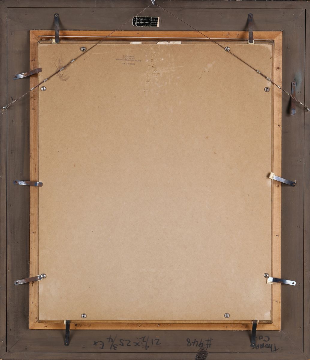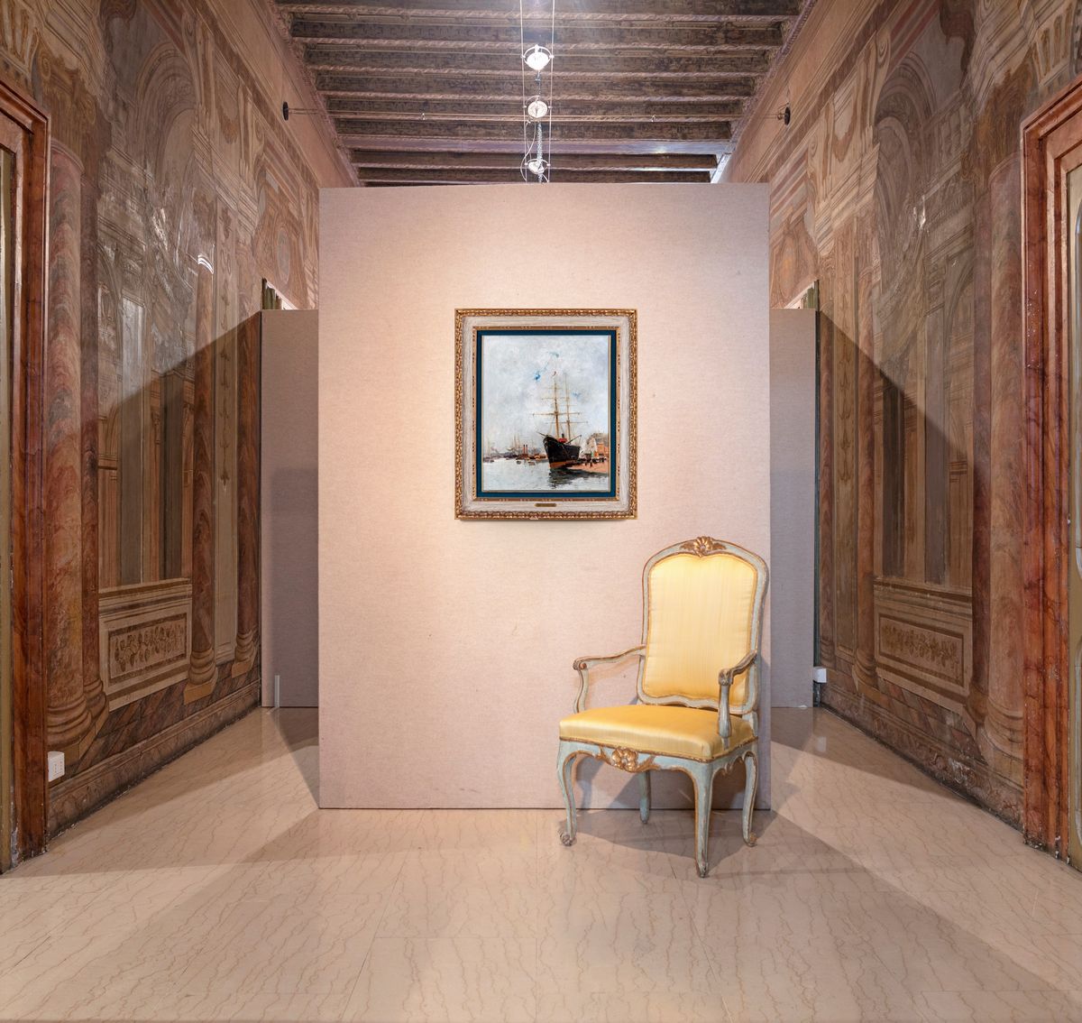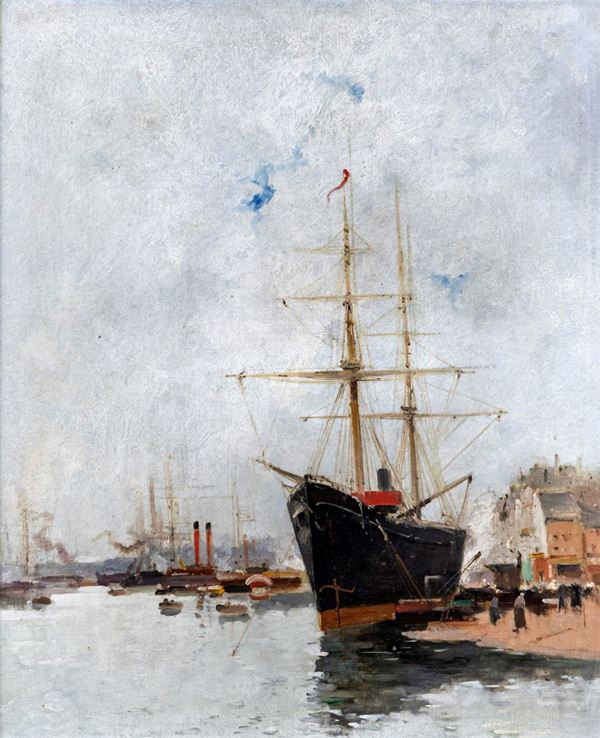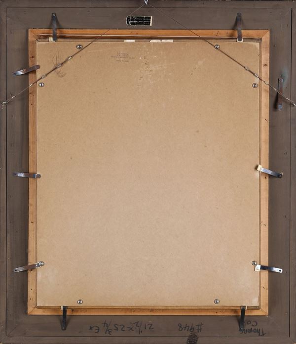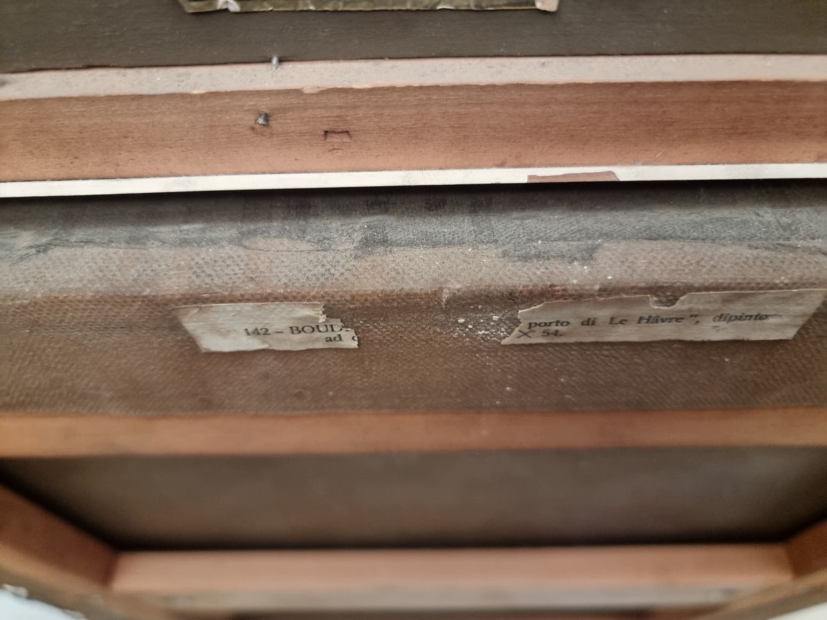 Opera non firmata. Sulla cornice, antica etichetta di attribuzione a Eugène Boudin (Honfleur, 12 luglio 1824 – Deauville, 8 agosto 1898). Al verso il quadro si presenta chiuso, con il sistema tradizionalmente in uso negli Stati Uniti, e reca etichetta antica del corniciaio, timbri diplomatici, e infine il timbro di Robert Scott Wiles, gallerista e curatore della Corcoran Gallery of Art di Washington dal 1970 al 1983.