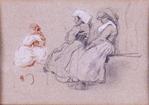 Due disegni: "Tre donne in costume laziale"; al verso "Paesaggio agricolo con covoni", 1920