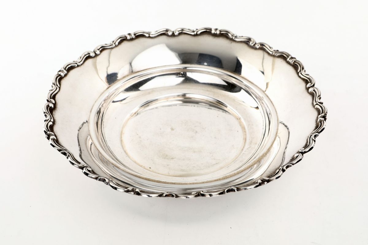 di forma circolare su tre piedi ed orlo sagomato sottolineato da volute in sequenza