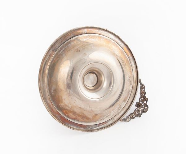 con portacandela a forma di coppa su piatto circolare con presa traforata costituita da volute vegetali e piccole corolle