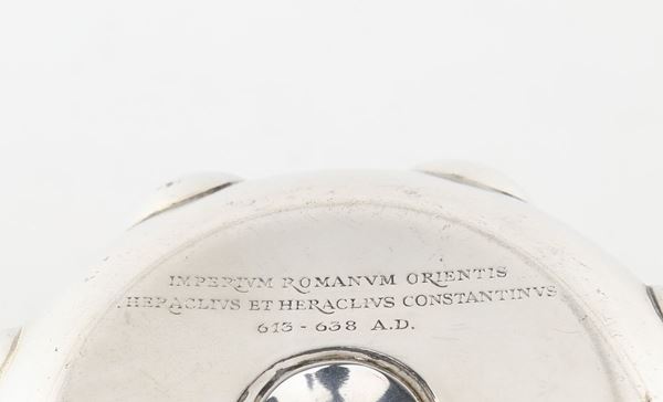 caratterizzato da otto ovali cabochon disposti lungo la circonferenza; al centro rimossa la moneta originale. Iscritto sotto la base "Imperium Romanum Orientis Heraclius et Heraclius Constantinus 613 - 638 A.D."