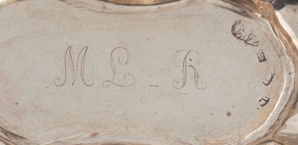 due diversi circolari con tralci d'uva sbalzati, a forma di acquamanile con iniziali incise e una vaschetta circolare con ammaccature sparse