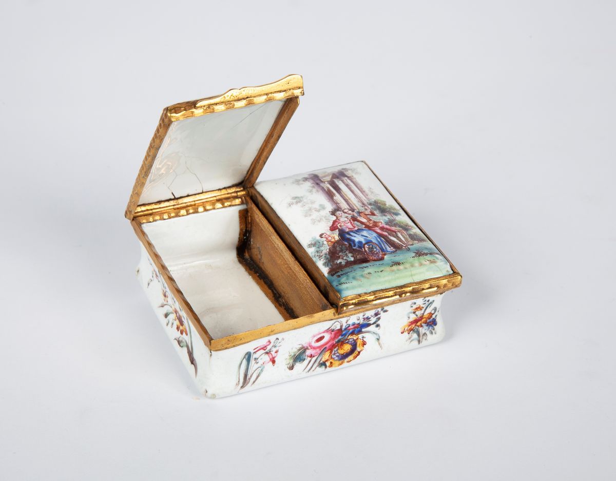 di orma rettangolare con coperchio bipartito decorato in vivace policromia da due scene galanti ambientate in un paesaggio con rovine architettoniche; lungo la fascia motivi floreali. Difetti
