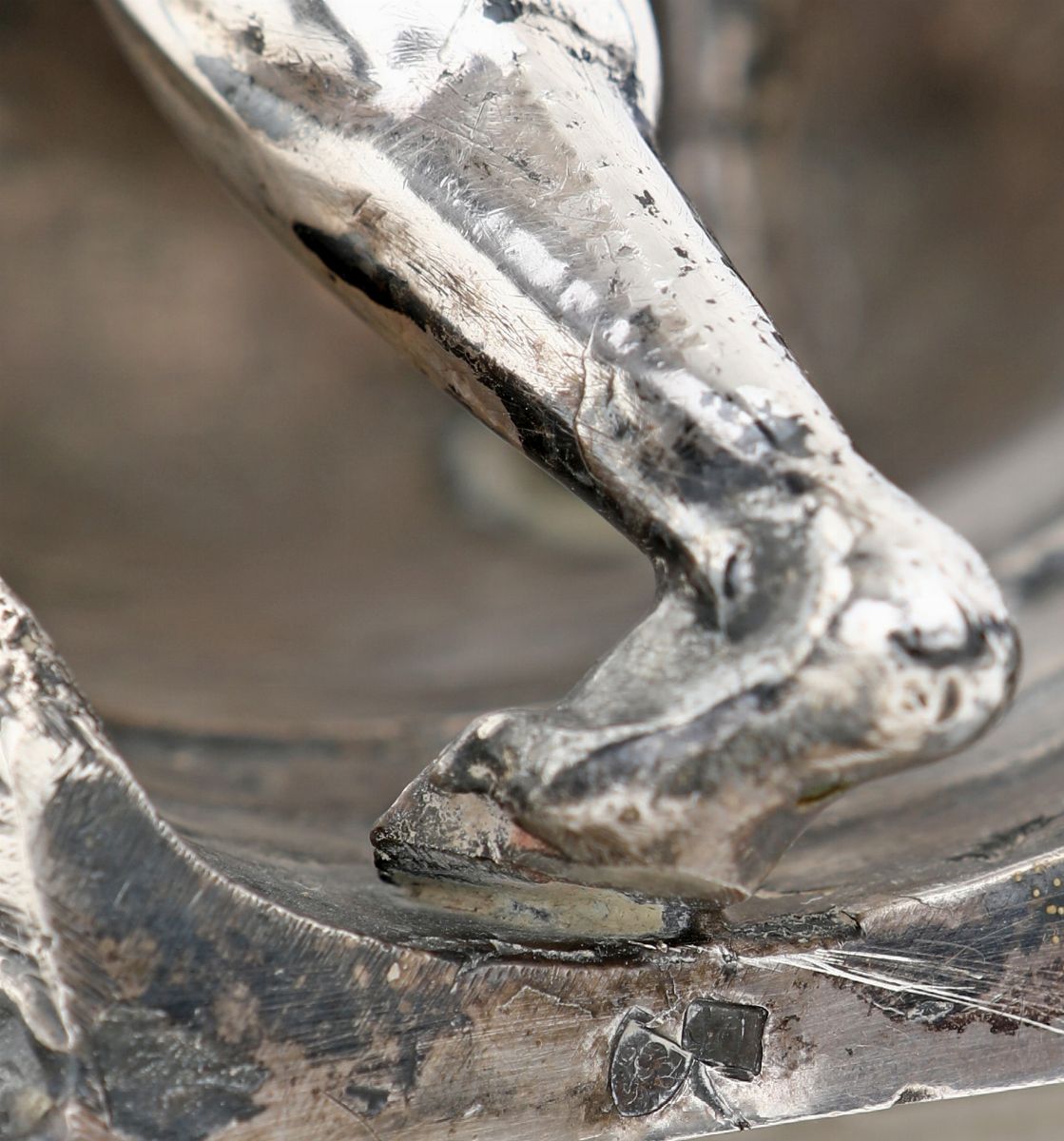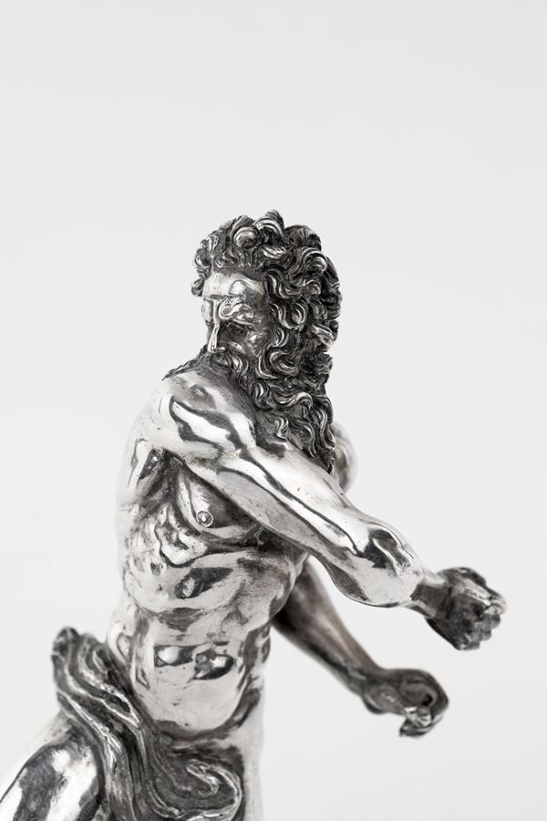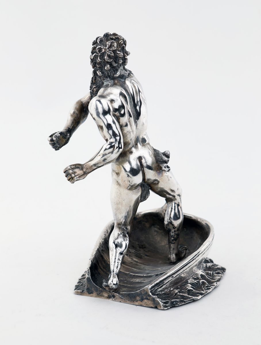 ritratto stante sulla prua del traghetto caratterizzato da testa di diavolo, con profilo inferiore increspato a simulare le onde dello Stige