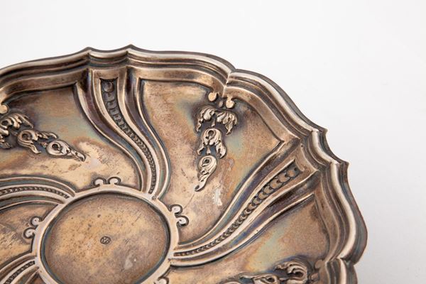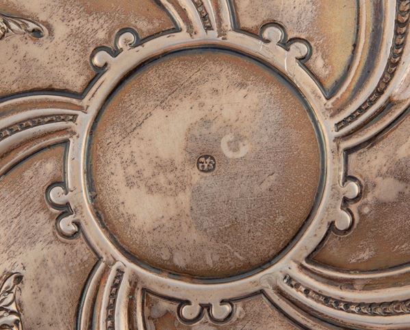 con decorazione sbalzata e cesellata in forma di cascatelle naturalistiche e scaglie semicircolari disposte entro riquadri sagomati ad andamento elicoidale; orlo sagomato e modanato. Al centro recano bollo ad imitazione città di Venezia