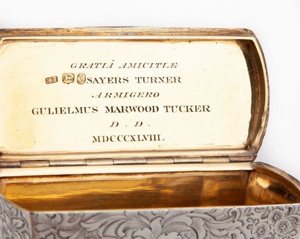 interamente decorata da volute vegetali e fiori incise sull'intera superficie; coperchio incernierato centrato da iniziali e dedica al verso "gratia amicitiae Sayers Turner armigero Guglielmus Marwood Tucker D.D. MDCCCXLVIII; interno dorato. Reca etichetta collezione S. Bulgari, Roma